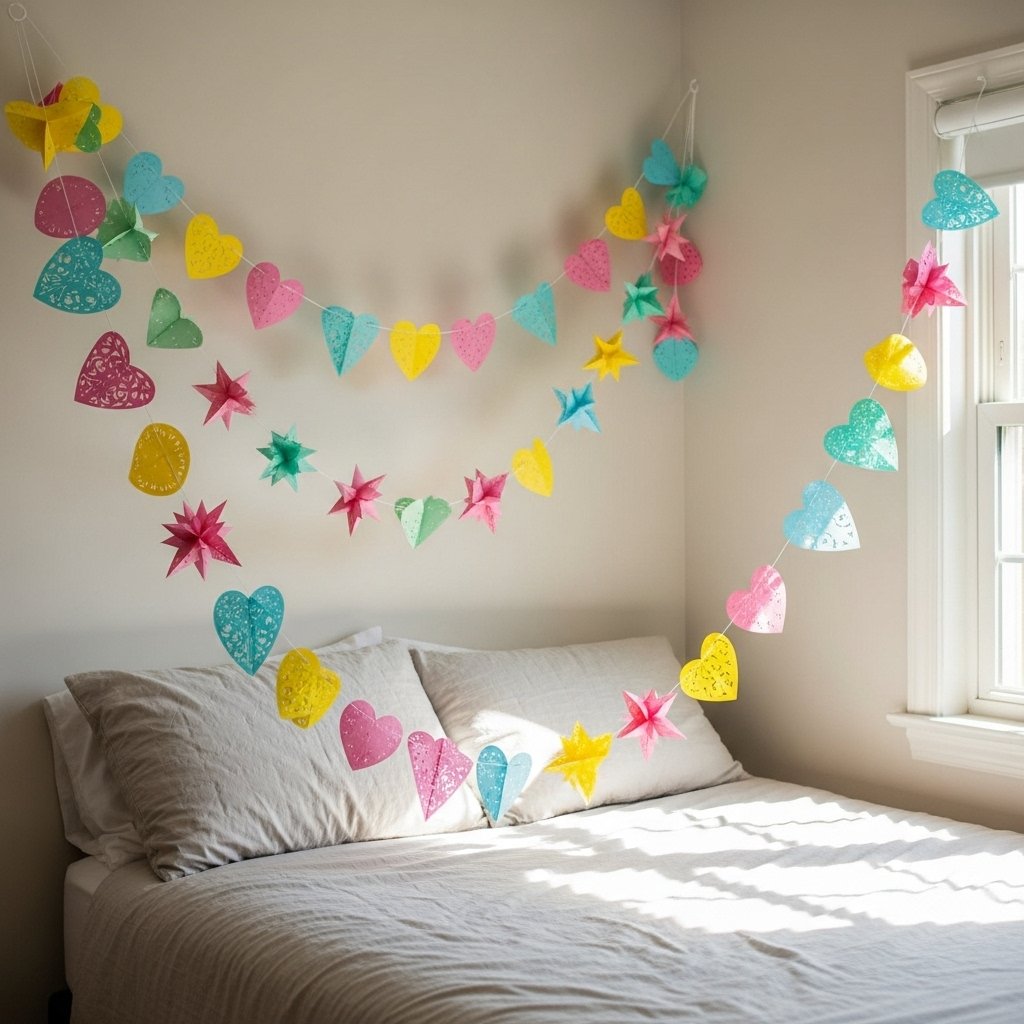 Paper garlands bring a festive and cheerful vibe to your bedroom. You can create shapes like triangles, circles, hearts, or stars using colored paper. String them across walls, windows, or above your bed for a playful touch. Paper garlands are inexpensive, easy to make, and can be customized to match any color theme. They instantly add charm and personality to the room.