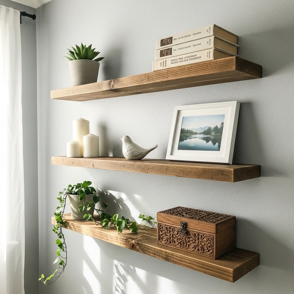 Floating shelves are both decorative and functional. You can make simple shelves using wooden planks and brackets, then paint or decorate them to match your room. Use them to display books, plants, or small décor items. Floating shelves save floor space and make your walls more attractive. This DIY project is practical and adds a modern touch to any bedroom.