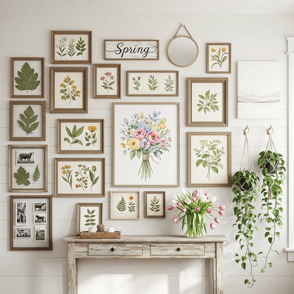 Updating wall décor is another effective way to celebrate the season. Botanical prints, floral artwork, or rustic wooden frames fit beautifully within farmhouse interiors. Gallery walls with nature-inspired images help bring the feeling of spring indoors. Mixing vintage frames with modern prints adds character and personality. These wall decorations help create a warm and stylish farmhouse atmosphere.