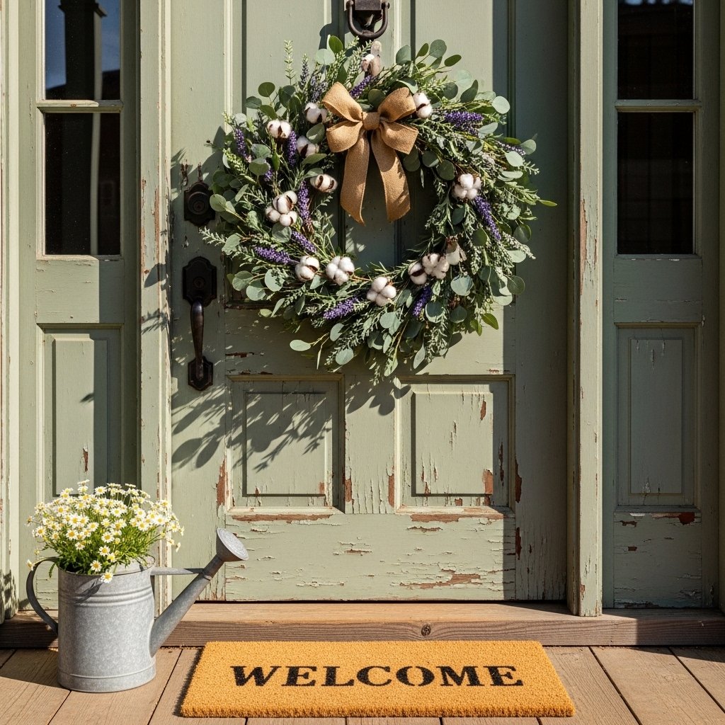Your porch is the perfect place to showcase farmhouse spring charm. Rocking chairs with light throw blankets and floral pillows create a relaxing outdoor seating area. Wooden crates filled with potted plants or flowers add natural beauty to the space. Lanterns and welcome signs help complete the rustic farmhouse look. These elements create a warm and inviting entrance for guests.