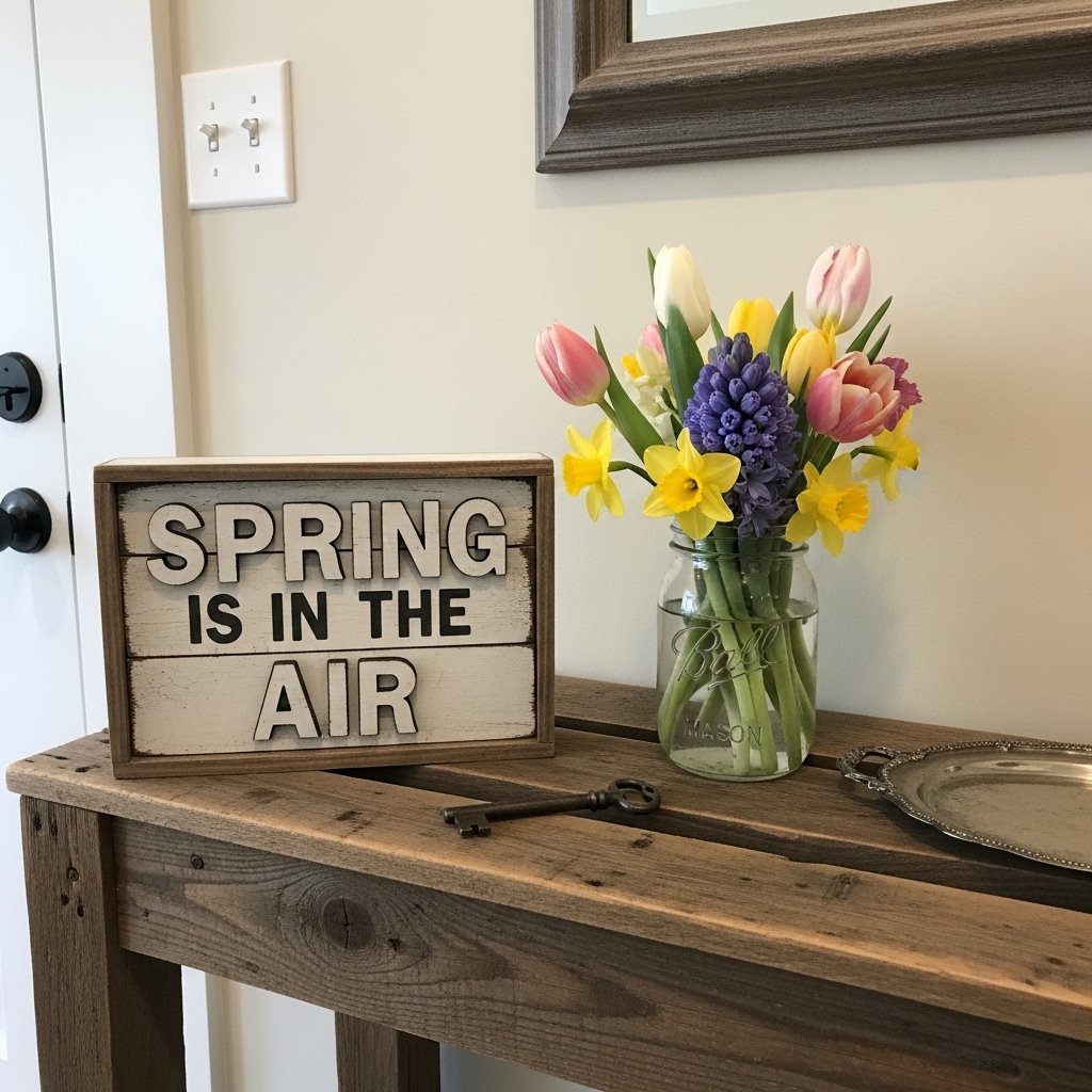 Decorative wooden signs are a staple in farmhouse-style homes. Adding signs with cheerful spring quotes like “Hello Spring” or “Fresh Flowers Daily” creates a seasonal focal point. These signs can be displayed on walls, mantels, or entry tables to add personality to your décor. Natural wood finishes or distressed paint enhance the rustic farmhouse feel. This decorating idea is affordable and easy to switch out with each season.