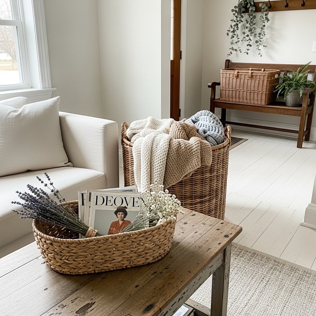 Woven baskets are both decorative and practical in farmhouse décor. During spring, they can be used to store blankets, magazines, or fresh flowers around the house. Natural materials like wicker or rattan complement rustic interiors beautifully. Placing baskets in living rooms, bedrooms, or entryways keeps spaces organized while maintaining a cozy aesthetic. They add texture and warmth while fitting perfectly with farmhouse design principles.