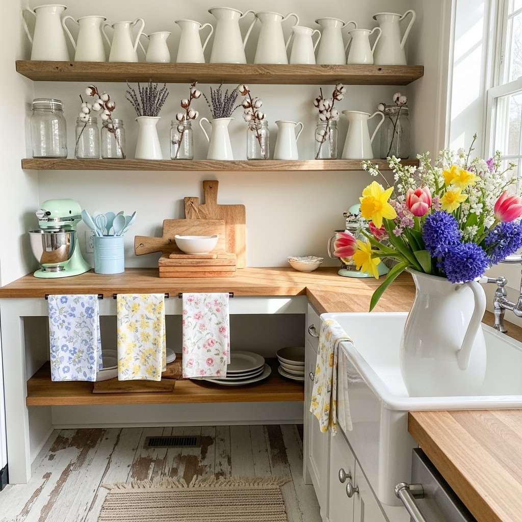 The kitchen is one of the best places to showcase farmhouse spring decorations. Simple touches like floral dish towels, wooden cutting boards, and ceramic pitchers filled with flowers create a welcoming environment. Open shelves can display vintage plates, glass jars, and greenery for a seasonal update. Light pastel accessories brighten the kitchen while maintaining the rustic farmhouse style. These small changes make everyday cooking spaces feel fresh and inviting.