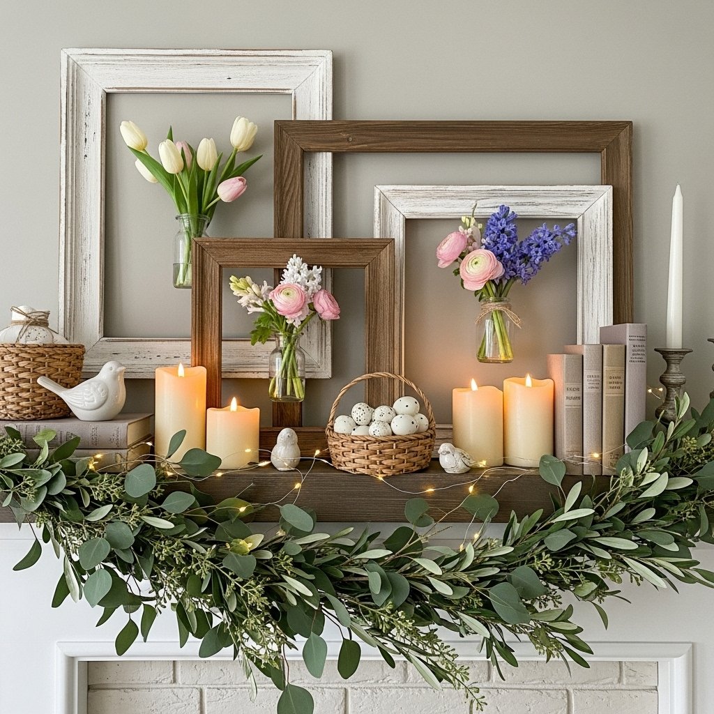 Decorating the mantel is another popular farmhouse spring decorating idea. Layering wooden frames, greenery garlands, and soft candles creates a balanced seasonal display. Adding small floral arrangements or pastel accents enhances the spring theme. Mixing heights and textures helps create visual interest without making the mantel feel cluttered. This simple arrangement transforms the living room into a cozy seasonal focal point.
