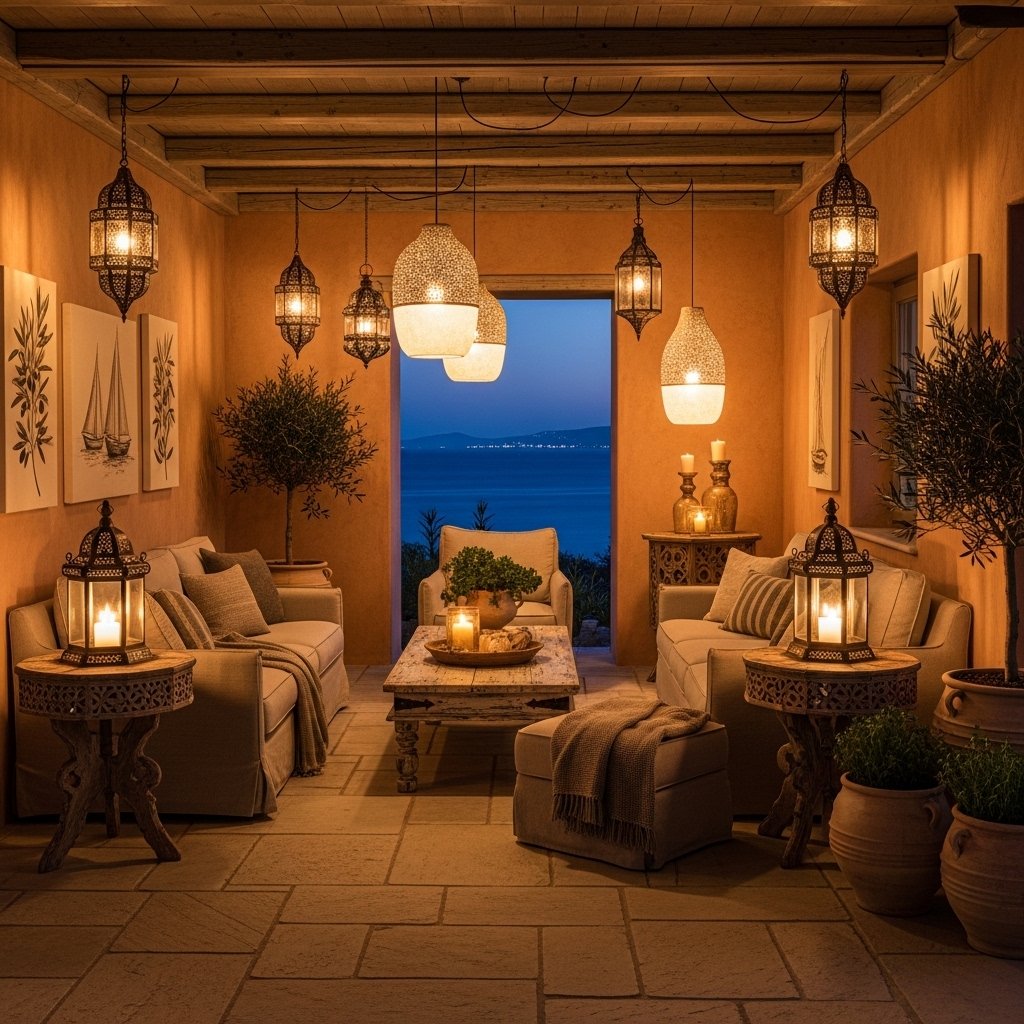 Lighting in Greek interiors is soft, warm, and inviting rather than harsh or overly bright. Use natural light as much as possible during the day, and complement it with warm-toned artificial lighting in the evening. Simple pendant lights, lanterns, or table lamps work beautifully within this style. The goal is to create a cozy and relaxing atmosphere. Proper lighting enhances the overall mood and highlights key design elements.