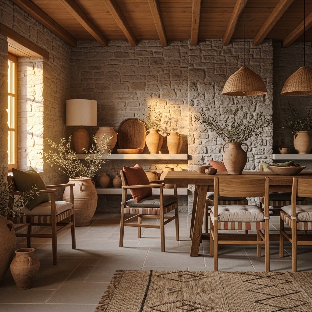 Greek interiors heavily rely on natural materials such as wood, stone, and clay to create warmth and authenticity. Wooden furniture with a slightly rustic finish adds character and durability. Stone elements, whether in flooring or accent walls, enhance the earthy feel of the space. Clay pots and ceramics introduce handcrafted charm and cultural depth. These materials help maintain a strong connection to nature, which is central to Greek design.