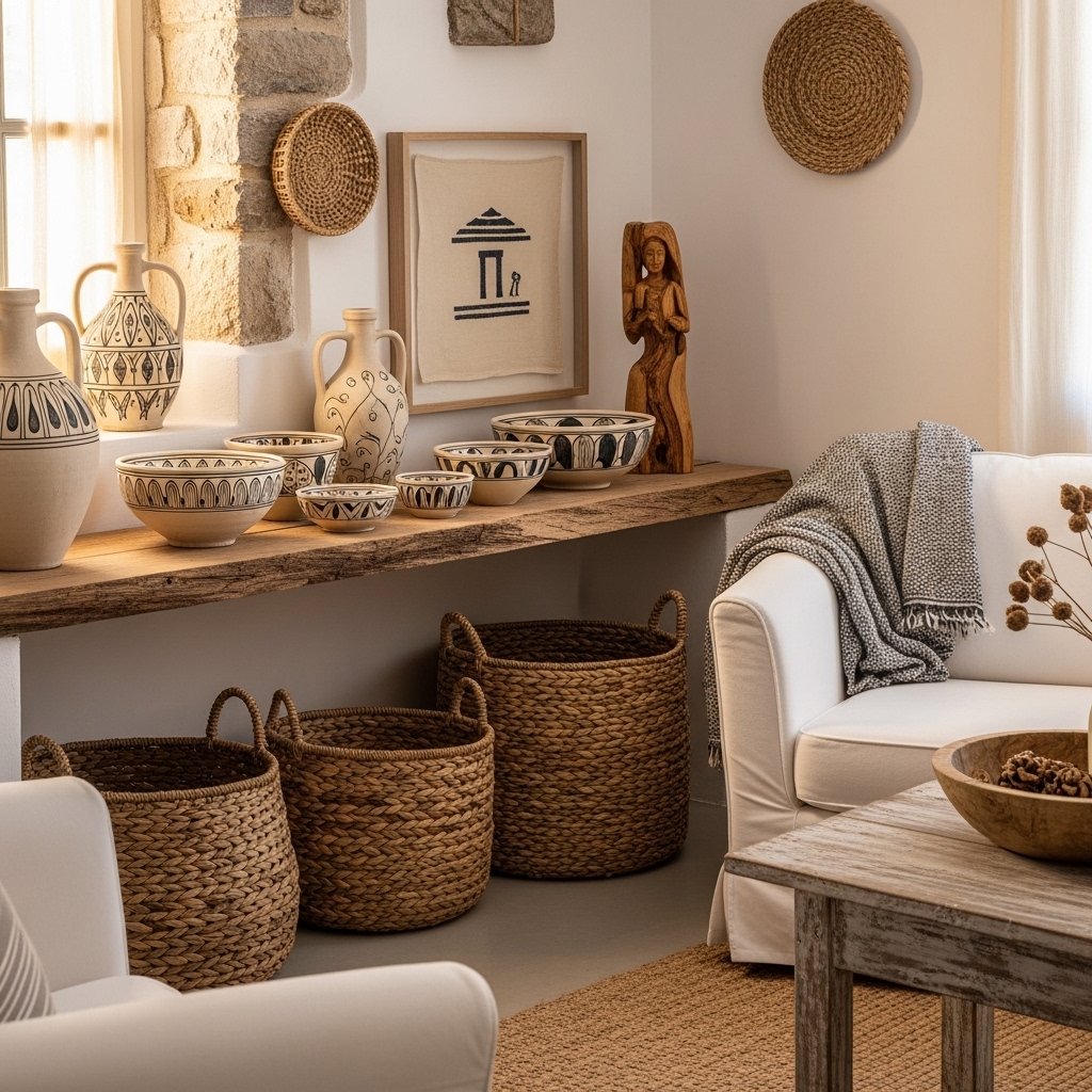 Handcrafted items are an essential part of Greek interior design, adding personality and authenticity. Decorative ceramics, woven baskets, and handmade textiles reflect traditional craftsmanship. These pieces often tell a story and bring cultural richness into the space. Avoid mass-produced decor and instead focus on unique, meaningful items. This not only enhances the aesthetic but also creates a more personal and inviting home.
