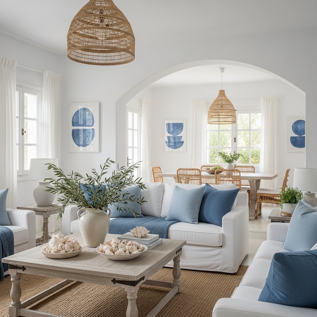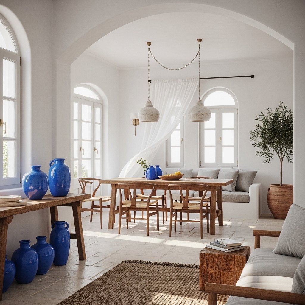 Greek home interior style is inspired by traditional Greek architecture and decor. It features white walls, blue accents, natural materials like wood and stone, and lots of light. The style creates a fresh, airy, and relaxed feeling, often reminding people of seaside homes in Greece. Simplicity and elegance are the main focus of this design.