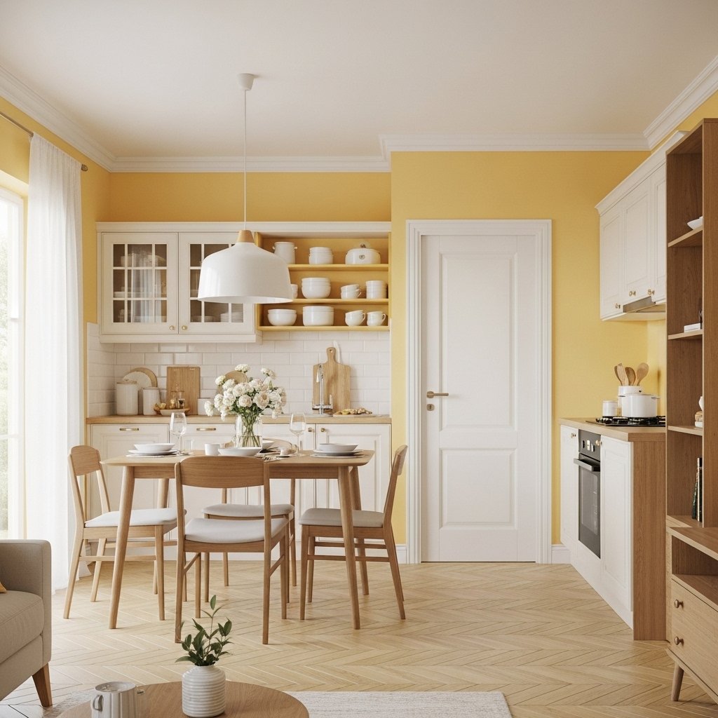 Yellow paired with cream creates a bright and cheerful interior atmosphere. This combination works well in kitchens, dining areas, or living spaces. The warmth of yellow adds energy, while cream keeps the look soft and balanced. Adding wooden or neutral furniture enhances the overall design. It’s a great option for creating a welcoming and lively home.