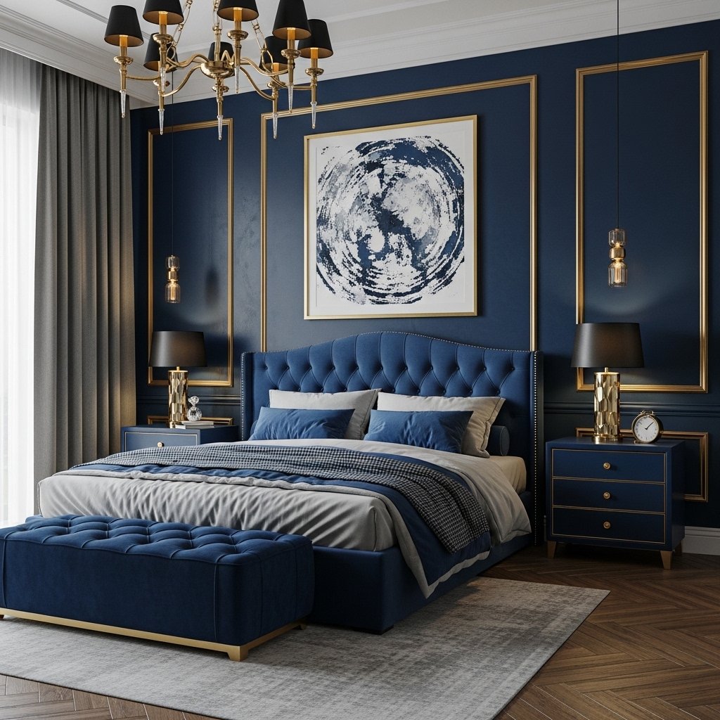 Navy blue combined with gold accents offers a rich and luxurious interior look. This bold color pairing works well in bedrooms and formal living spaces. The deep blue adds depth, while gold elements bring elegance and sophistication. Using this palette in moderation ensures the space doesn’t feel overwhelming. It’s a perfect choice for creating a high-end interior design.