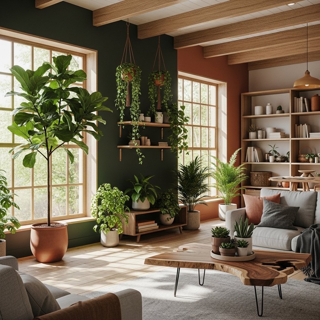 Nature-inspired interiors bring outdoor freshness inside your home. Indoor plants, wooden textures, and earthy tones create a refreshing atmosphere. Large windows and natural light enhance the connection with nature. This design improves air quality and promotes mental well-being. It is perfect for those who enjoy a peaceful and eco-friendly lifestyle.