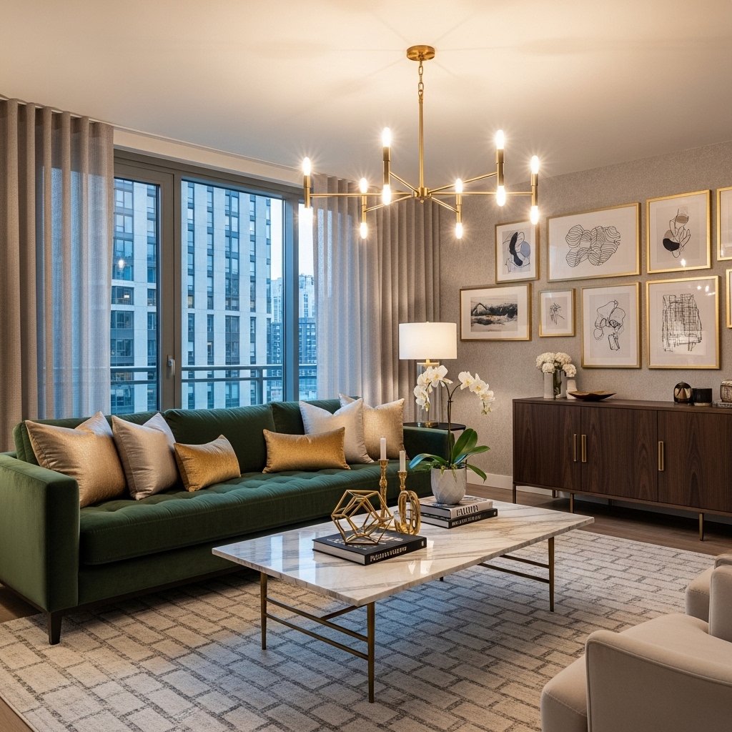 A modern luxury living room blends elegance with comfort using high-end materials and stylish furniture. Velvet sofas, marble coffee tables, and gold accents create a sophisticated vibe. Soft lighting through chandeliers or LED strips adds depth and warmth to the space. This design often includes statement décor pieces that elevate the overall look. It is ideal for homeowners who want a premium and polished interior feel.