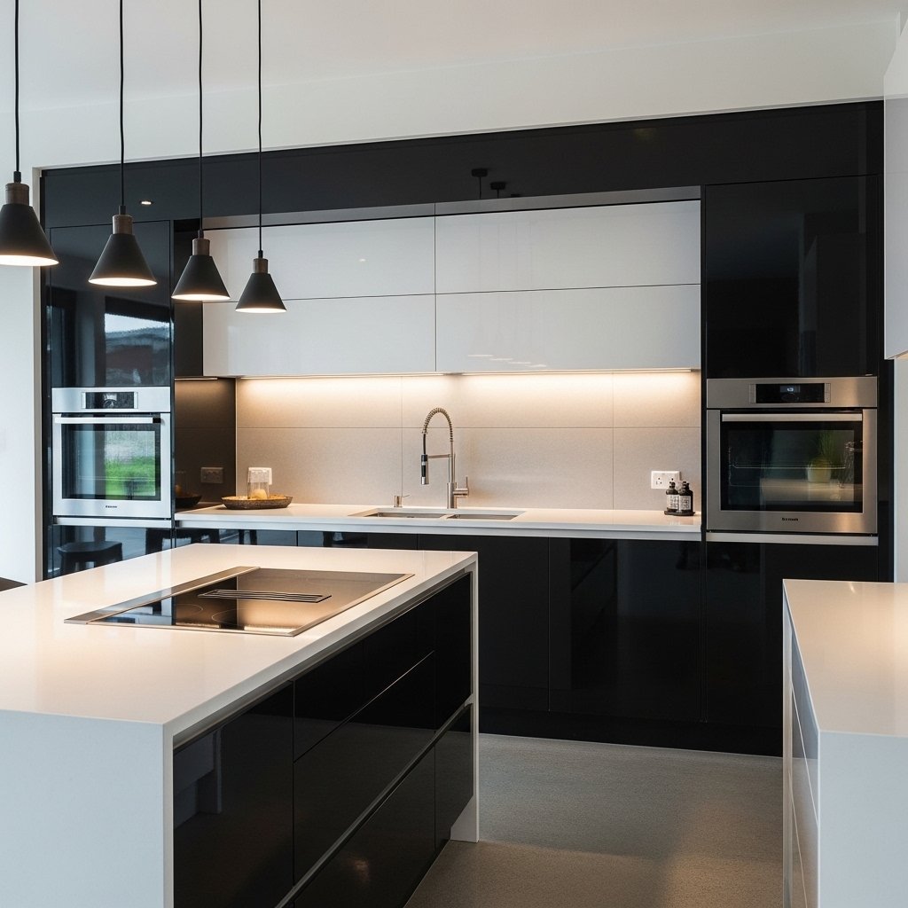 A modern kitchen combines functionality with sleek design elements. Glossy cabinets, quartz countertops, and smart storage solutions create a clean and efficient space. Neutral colors like white, grey, and black are commonly used for a polished look. Under-cabinet lighting enhances visibility and style at the same time. This design is ideal for both cooking convenience and aesthetic appeal.