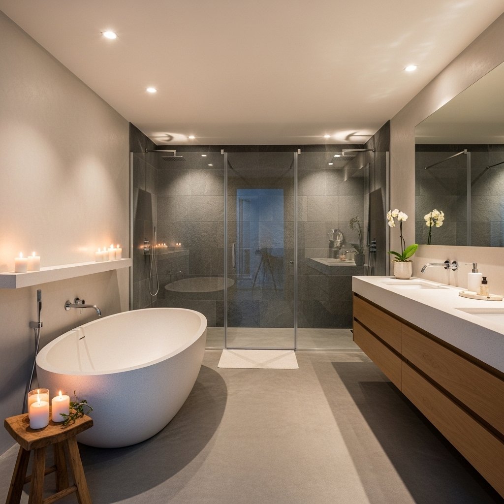 A spa-inspired bathroom turns your home into a relaxation zone. Features like glass showers, freestanding bathtubs, and stone textures create a calming environment. Soft lighting and scented candles enhance the spa-like experience. Neutral colors and clean lines keep the space elegant and peaceful. This design is perfect for self-care and relaxation after a long day.
