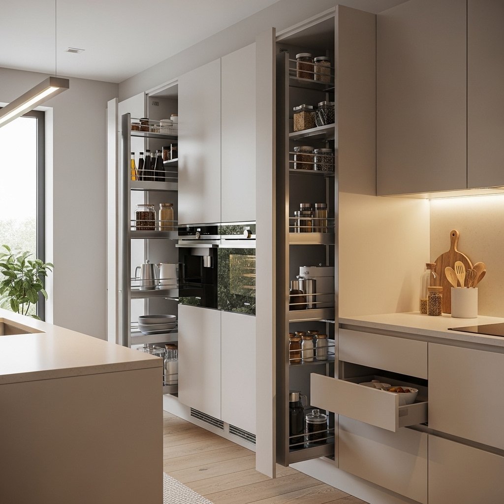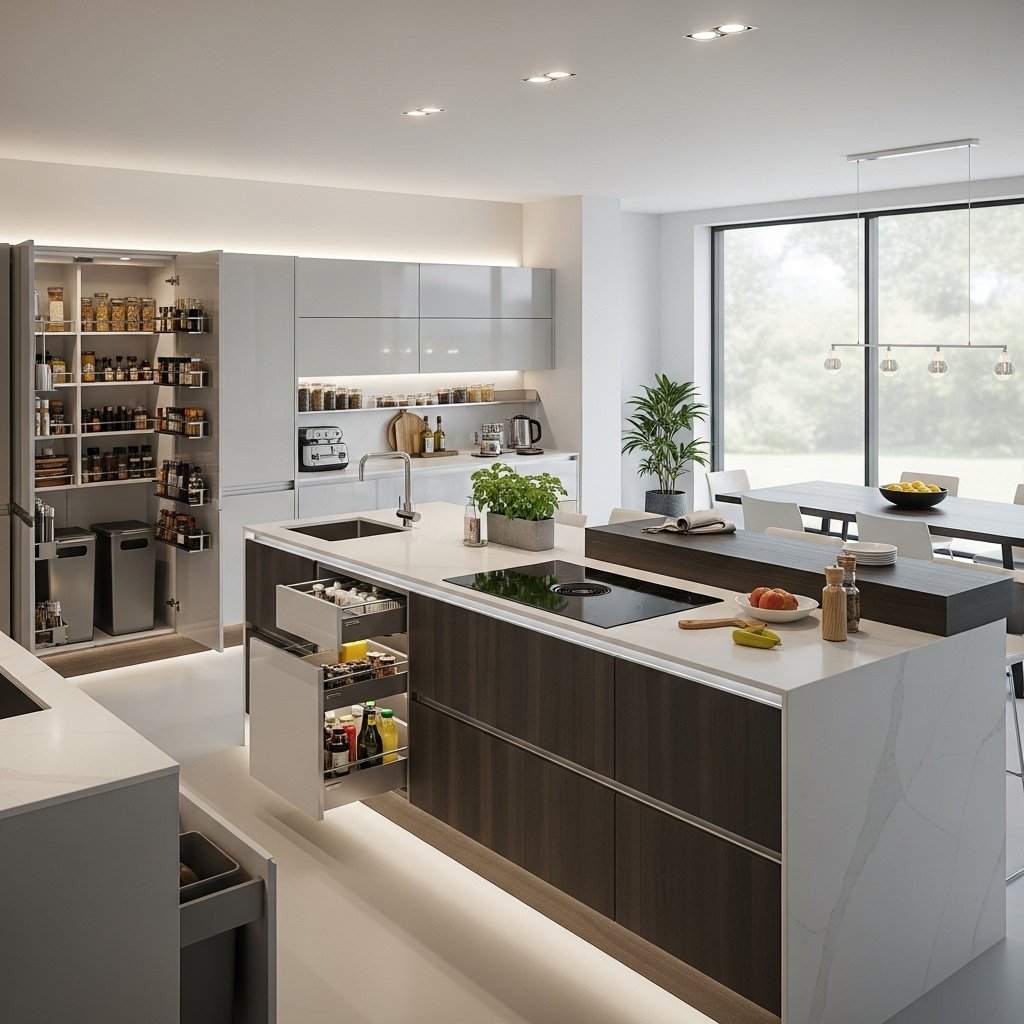 Smart storage is essential for maintaining an organized and efficient kitchen interior. Using vertical cabinets, pull-out shelves, and hidden compartments helps maximize space. This design reduces clutter and keeps everything within easy reach. Smart storage solutions are especially useful in smaller kitchens where space is limited. A well-organized kitchen improves both functionality and visual appeal.