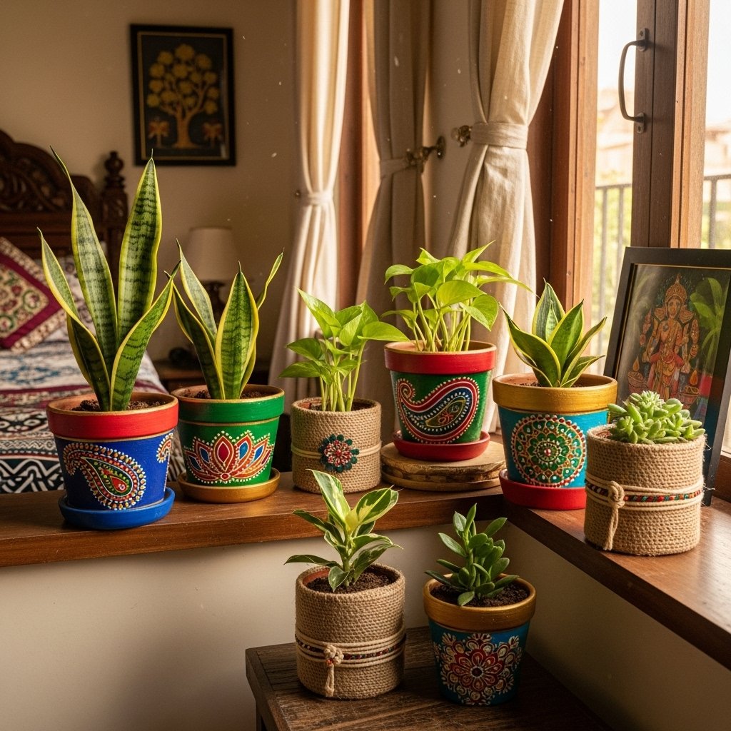 Indoor plants bring freshness and positivity into Indian bedrooms. You can decorate clay or plastic pots using paint, jute rope, or traditional patterns. Plants like money plant, tulsi, or snake plant are easy to maintain. Placing them near windows or corners adds natural beauty. This simple DIY idea improves both décor and air quality.