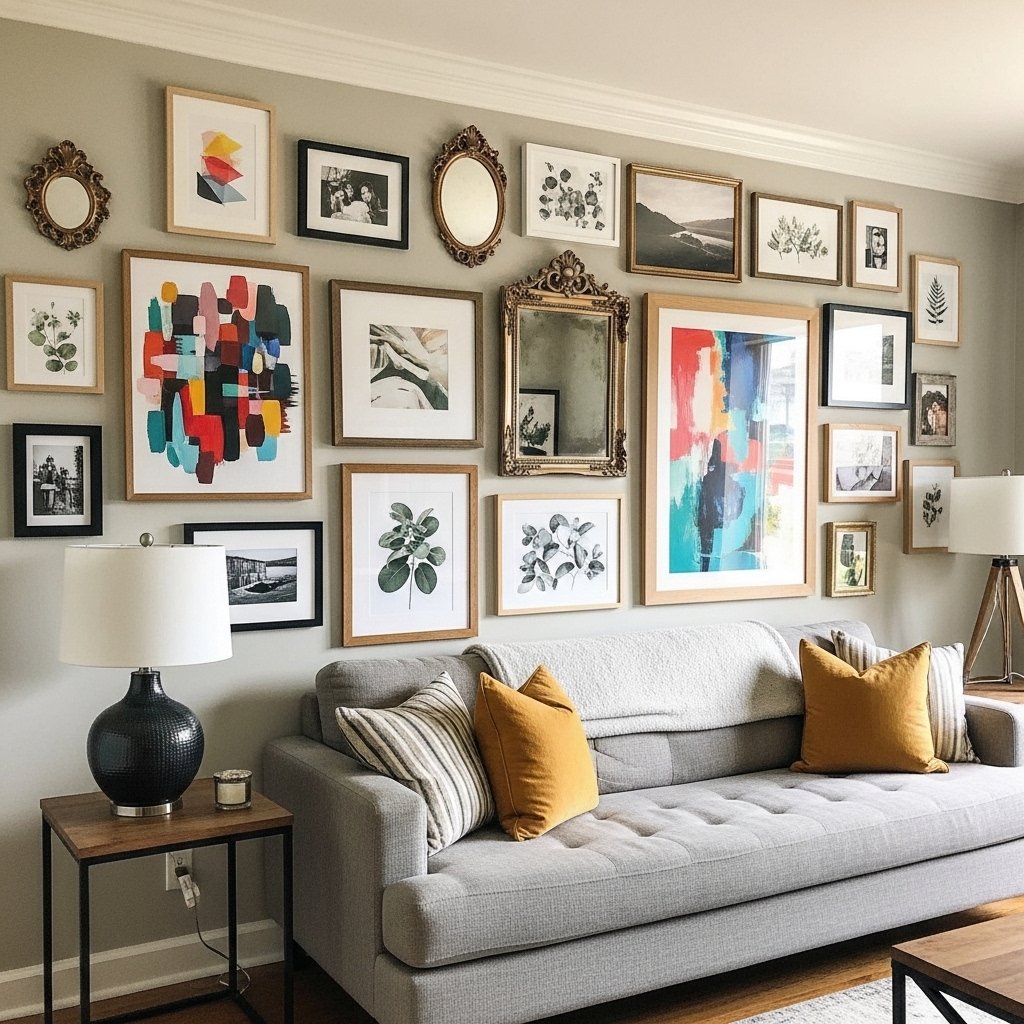 A gallery wall background showcases art, photos, or prints in a curated arrangement. This style adds personality and storytelling to your interior design. Mixing different frame styles and sizes creates visual interest. It’s a great way to display personal memories or creative artwork. This idea works well in living rooms, hallways, or home offices.
