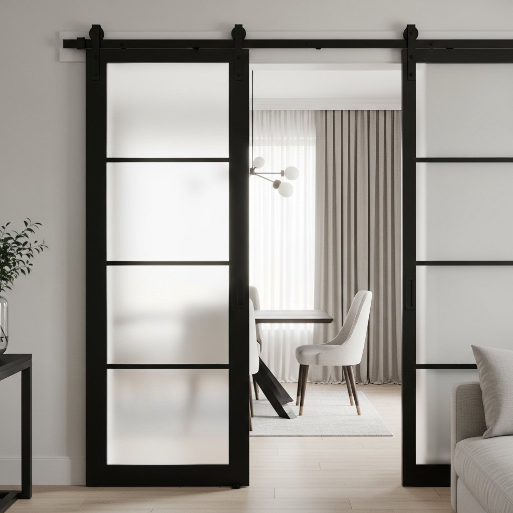 Glass panel barn doors combine transparency with structure for a sophisticated look. They often feature frosted, clear, or textured glass framed with wood or metal. This design allows natural light to flow between rooms while still providing separation. It works especially well for home offices, kitchens, or dining areas. Glass barn doors create an open yet private atmosphere in interior spaces.