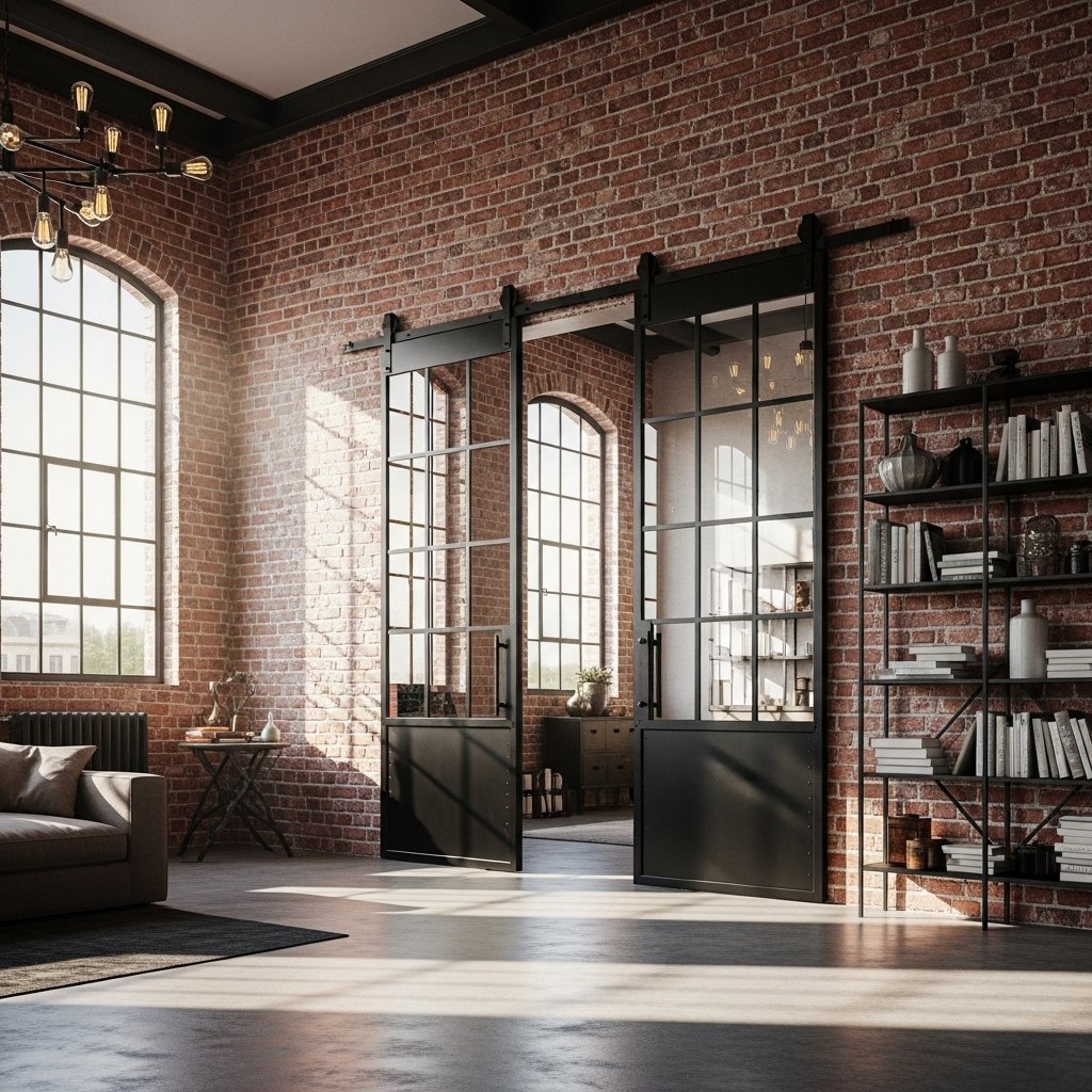 Black framed industrial barn doors are inspired by loft-style urban interiors. They typically feature metal frames with glass or wood inserts for a bold, structured appearance. This design adds contrast and a strong visual statement to neutral spaces. It pairs perfectly with exposed brick, concrete walls, and modern furniture. Industrial barn doors are ideal for living rooms, studios, and contemporary apartments.