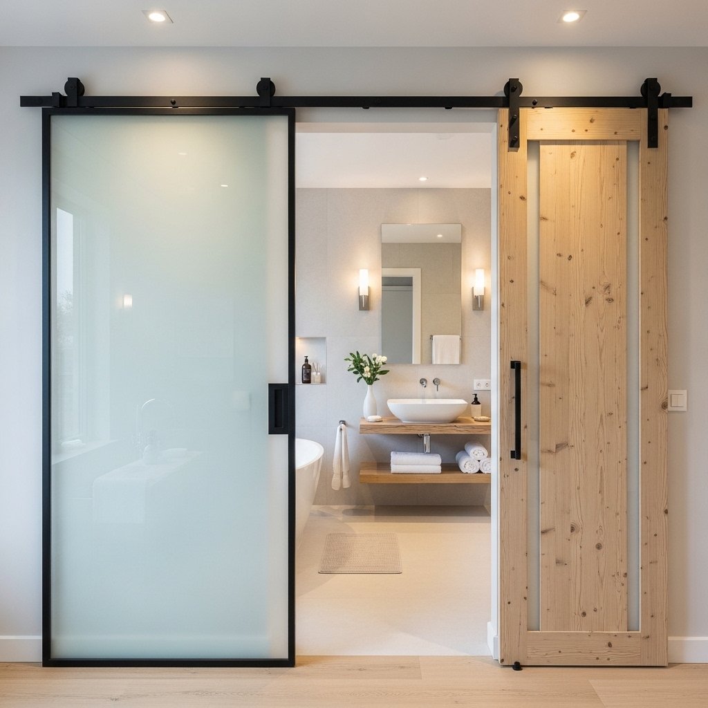 Sliding barn doors are an excellent space-saving solution for bathrooms. They eliminate the need for swing space, making them ideal for compact layouts. Frosted glass or solid wood designs ensure privacy while maintaining style. This option adds a modern touch to bathroom entrances and enhances functionality. Bathroom barn doors are especially useful in small apartments and tight spaces.