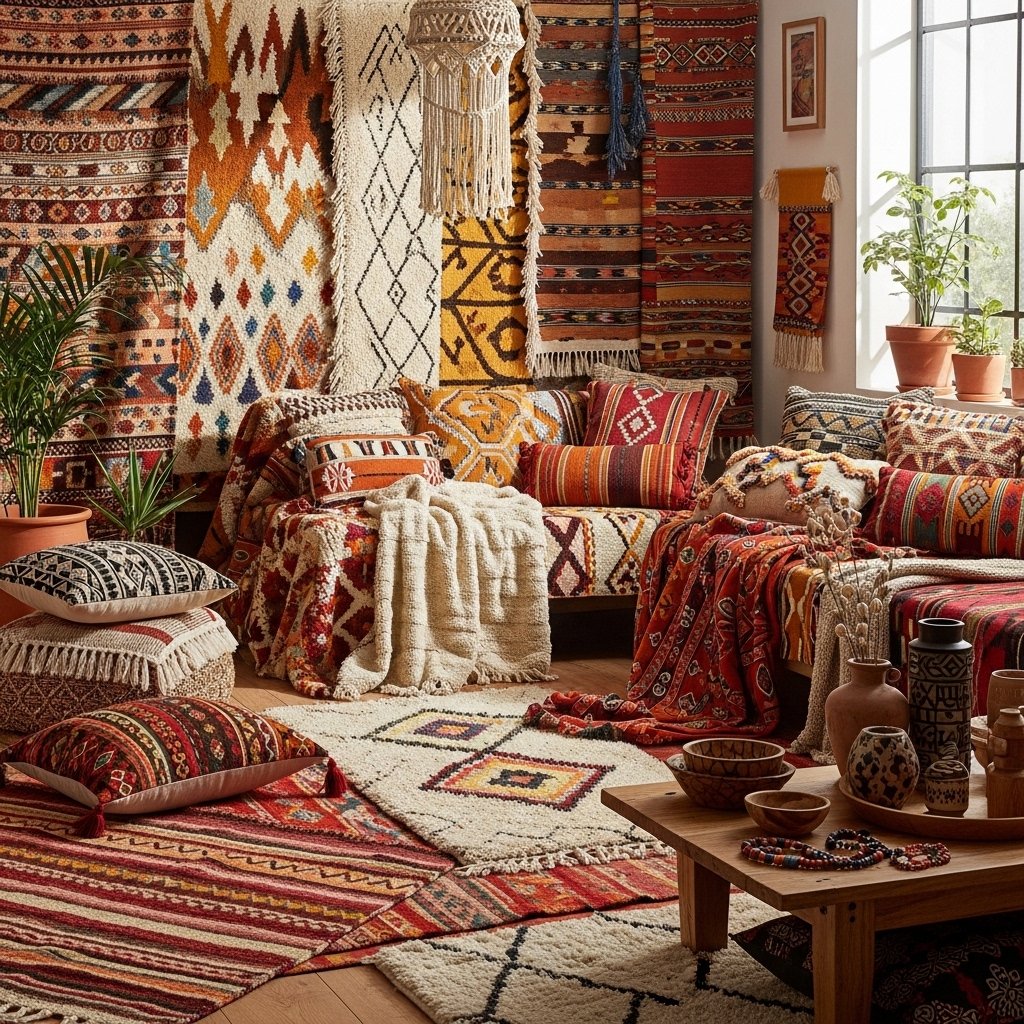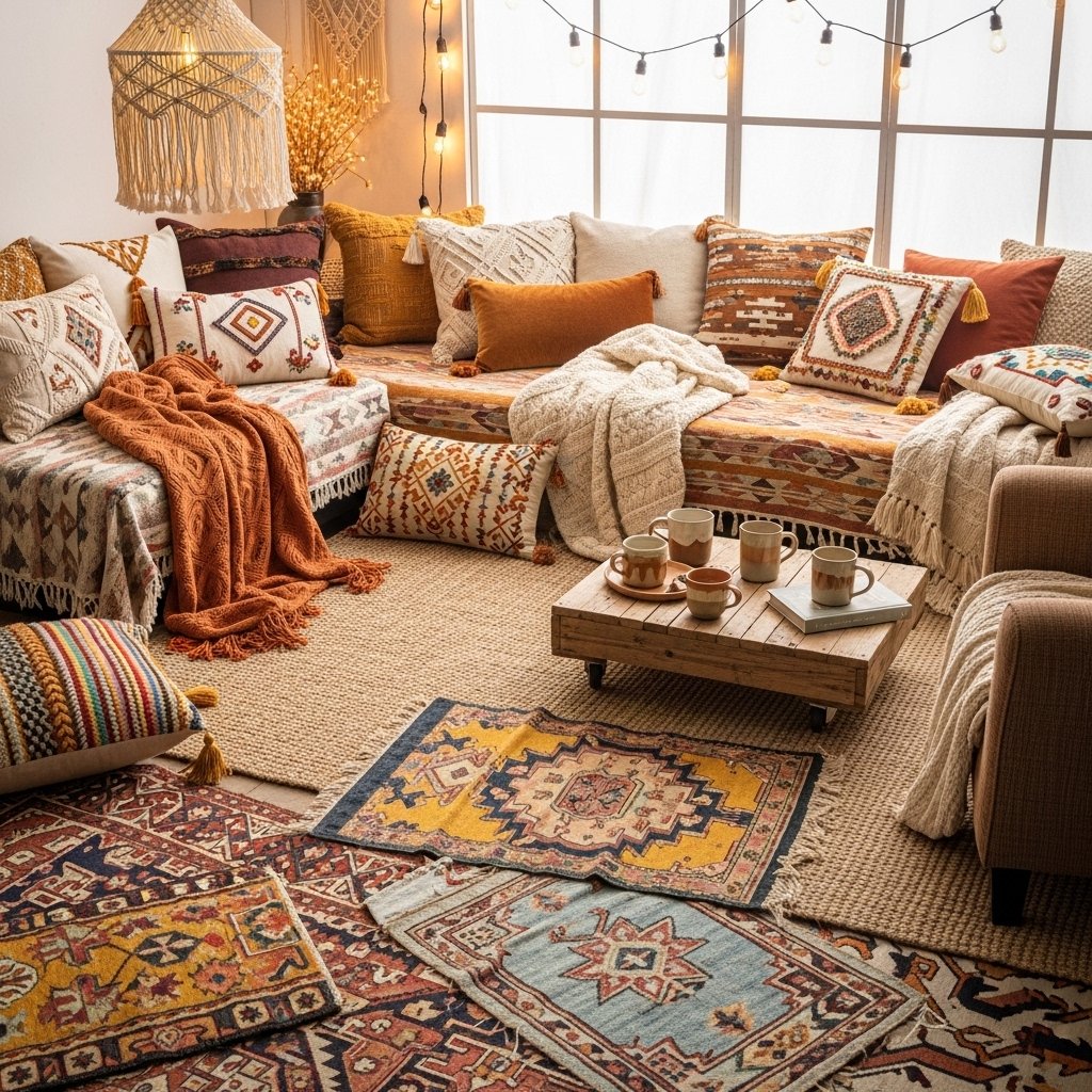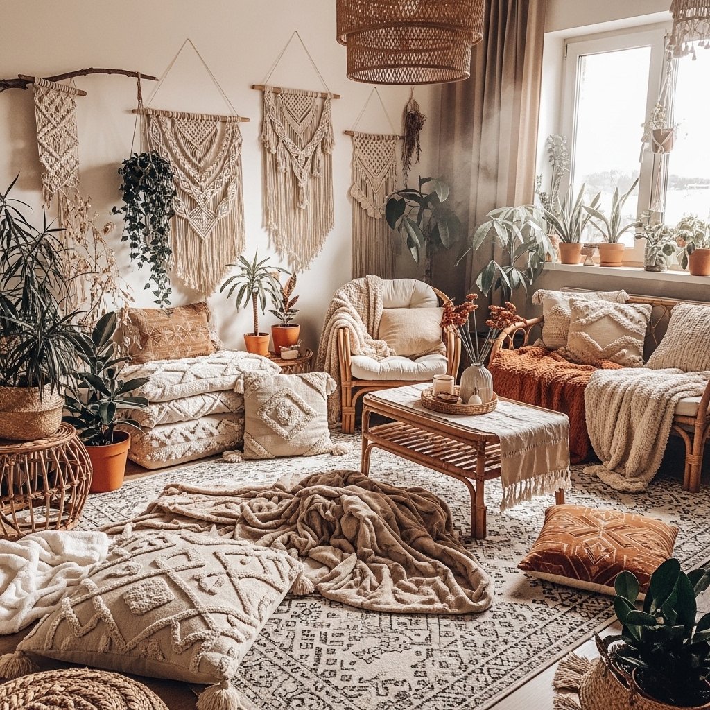 Layering textiles is essential for achieving a true boho interior look filled with comfort and charm. Use a mix of rugs, throws, cushions, and blankets in different patterns and fabrics. Materials like cotton, wool, and linen create softness while adding depth to the design. Mixing textures such as macramé, crochet, and woven fabrics enhances the bohemian aesthetic. This approach makes any room feel warm, inviting, and effortlessly stylish.