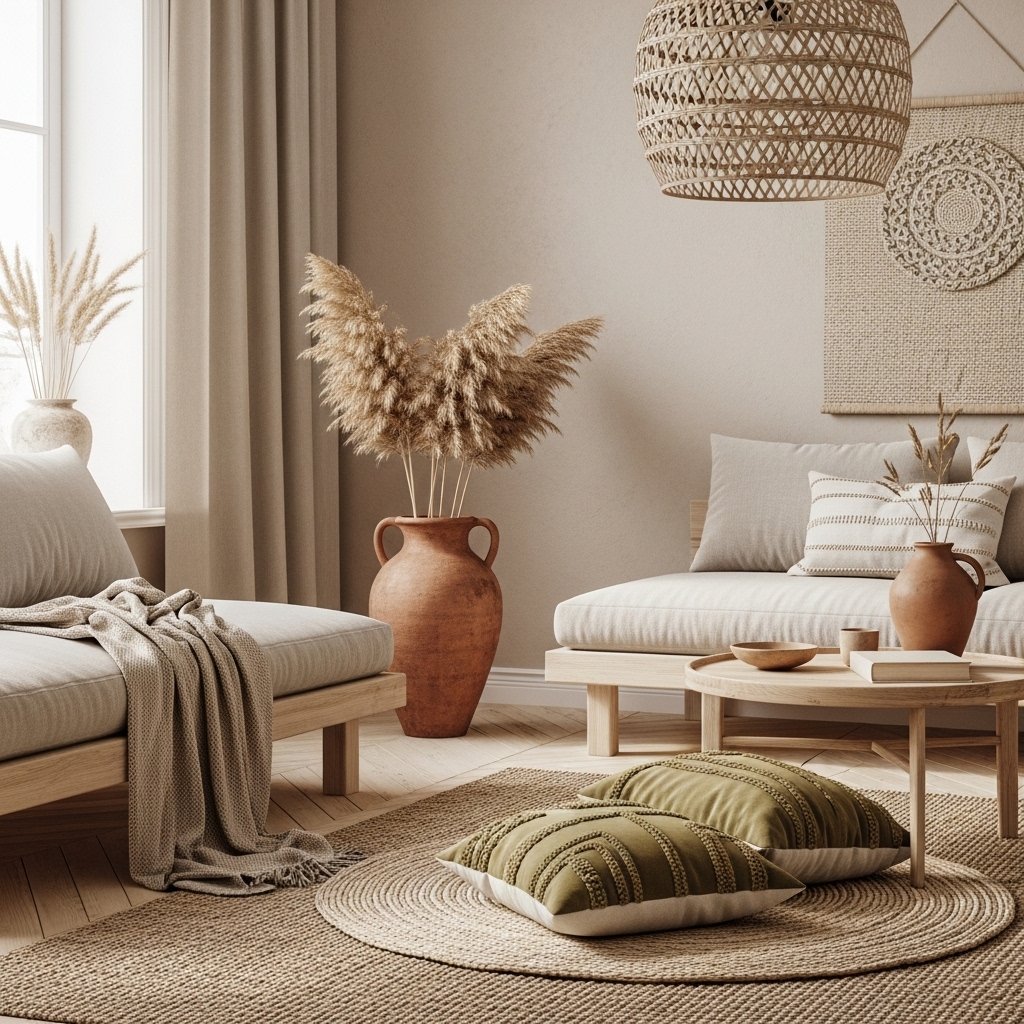 A neutral color palette is the foundation of interior boho design, creating a calm and inviting atmosphere. Shades like beige, cream, white, and soft browns help establish a natural base for layering textures and décor. Earthy tones such as terracotta, olive green, and rust add warmth without overwhelming the space. These colors reflect nature and promote a peaceful, grounded feeling in your home. Combining neutrals with subtle pops of warm hues makes the space feel balanced and visually appealing.