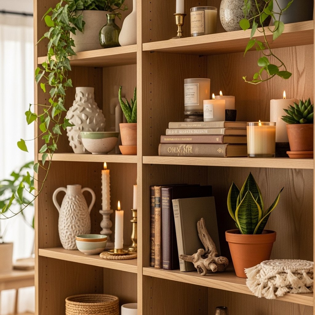 Open shelving is a great way to display decorative items in a boho interior. Use shelves to showcase plants, books, candles, and handmade objects. Arranging items in a slightly imperfect, organic way enhances the relaxed aesthetic. Mixing materials like wood, ceramics, and glass adds visual interest. This approach keeps your space functional while maintaining a stylish, curated look.