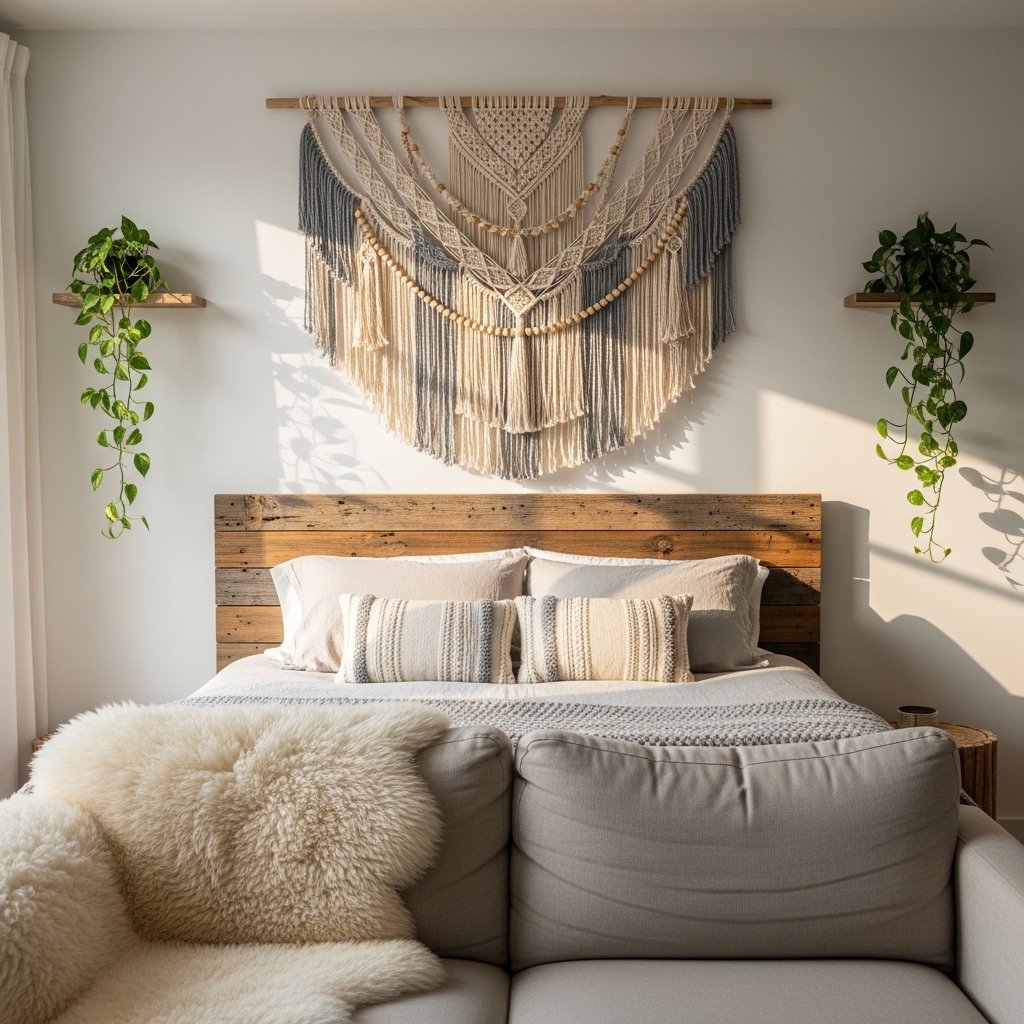 Macramé décor is a signature element in interior boho styling that adds texture and artistic detail. Wall hangings, plant holders, and woven art pieces bring a handcrafted feel to your space. These pieces often feature neutral tones, making them easy to blend with other décor elements. Macramé adds visual interest without cluttering the room, keeping the design light and airy. It’s a perfect way to enhance walls while maintaining a relaxed, bohemian vibe.
