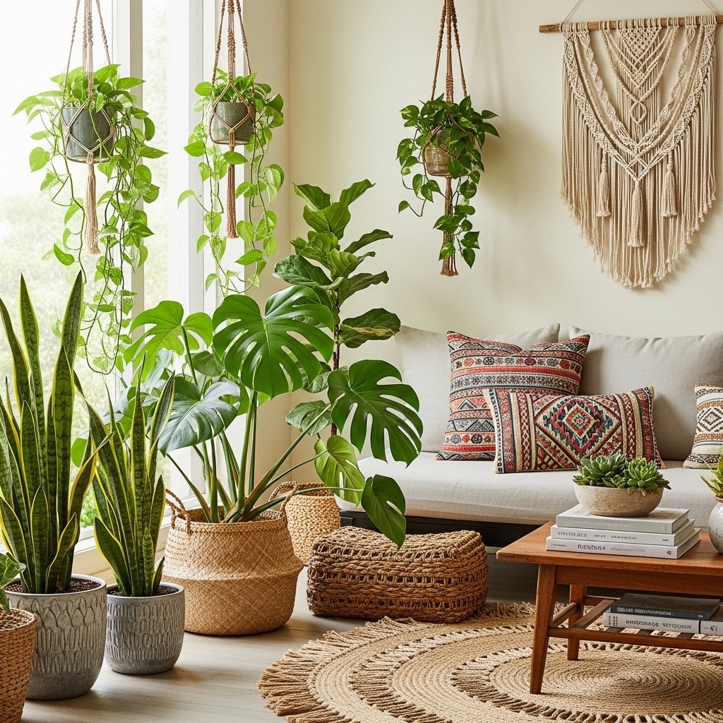 Indoor plants play a major role in creating a fresh and lively boho interior. Plants like snake plants, pothos, and fiddle leaf figs add greenery and improve the overall ambiance. They bring a sense of calm and connection to nature, which is central to boho design. Placing plants in woven baskets, ceramic pots, or hanging planters enhances their visual appeal. A mix of large and small plants creates depth and makes the space feel more dynamic.