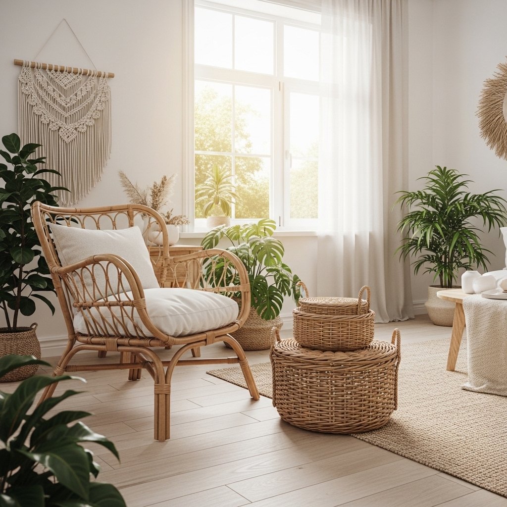 Rattan and wicker furniture are key elements in interior boho design, adding a natural and airy feel. Chairs, coffee tables, and storage baskets made from these materials bring warmth and texture. Their light tones pair beautifully with neutral color palettes and earthy décor. These accents are not only stylish but also practical and durable. Incorporating rattan and wicker helps create a relaxed, tropical-inspired atmosphere.