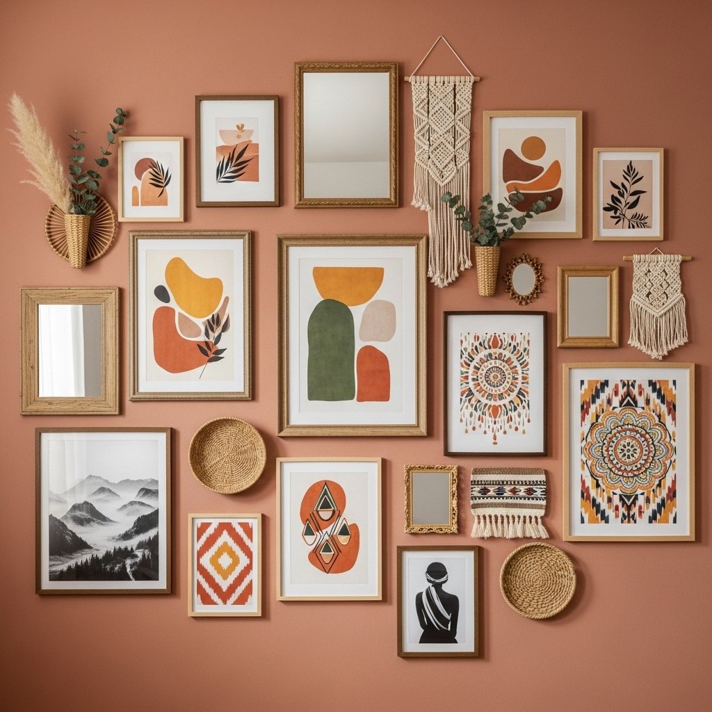 Boho wall art allows you to express creativity through unique and meaningful pieces. A gallery wall featuring prints, paintings, and handmade art creates a focal point in any room. Mixing frames, textures, and sizes adds an eclectic and artistic touch. Natural themes, abstract designs, and cultural patterns work especially well in boho interiors. This idea transforms blank walls into visually rich and inspiring spaces.