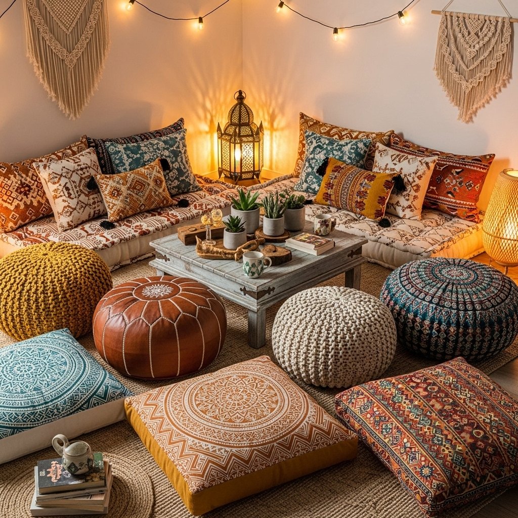 Low seating is a hallmark of boho interiors, promoting comfort and a laid-back lifestyle. Floor cushions, poufs, and low sofas create a cozy and inviting seating area. These pieces encourage relaxation and make the space feel more casual and welcoming. Mixing different shapes, patterns, and colors enhances the bohemian aesthetic. This setup is perfect for living rooms, reading corners, or chill-out spaces.