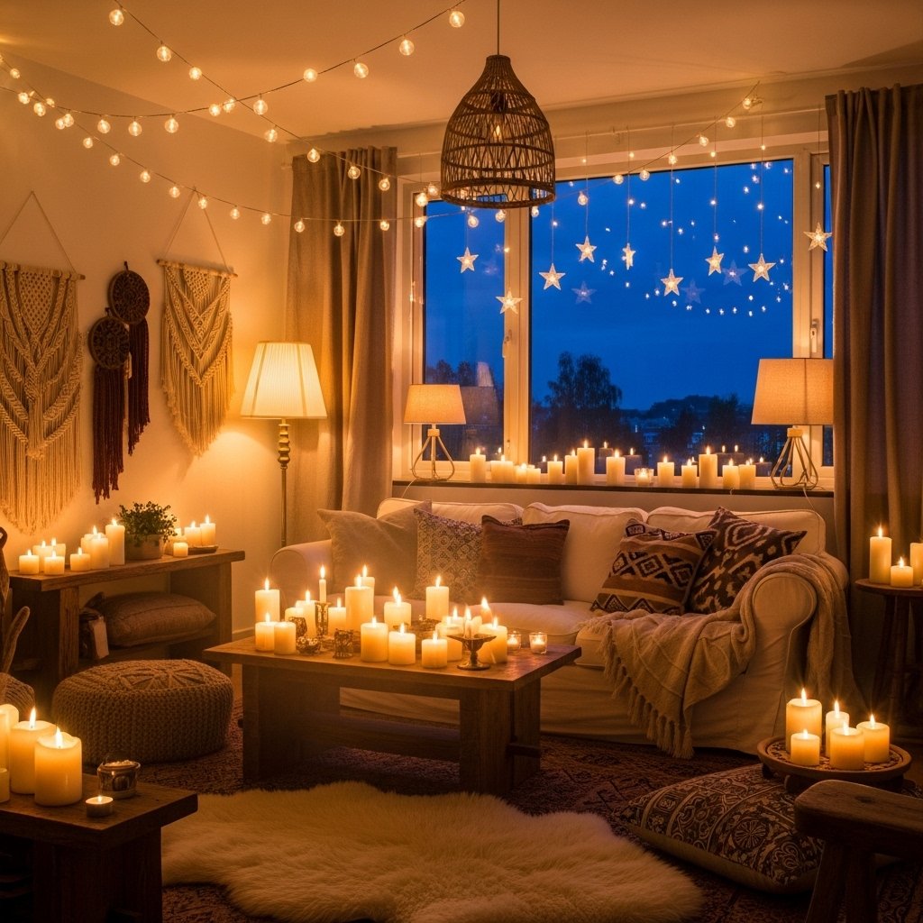 Lighting plays a crucial role in setting the mood for an interior boho space. Soft, warm lighting creates a cozy and relaxing atmosphere. Use string lights, lanterns, candles, and floor lamps to add layers of illumination. Natural materials like bamboo or woven lamp shades enhance the boho feel. This type of lighting makes the space feel intimate, calm, and visually soothing.