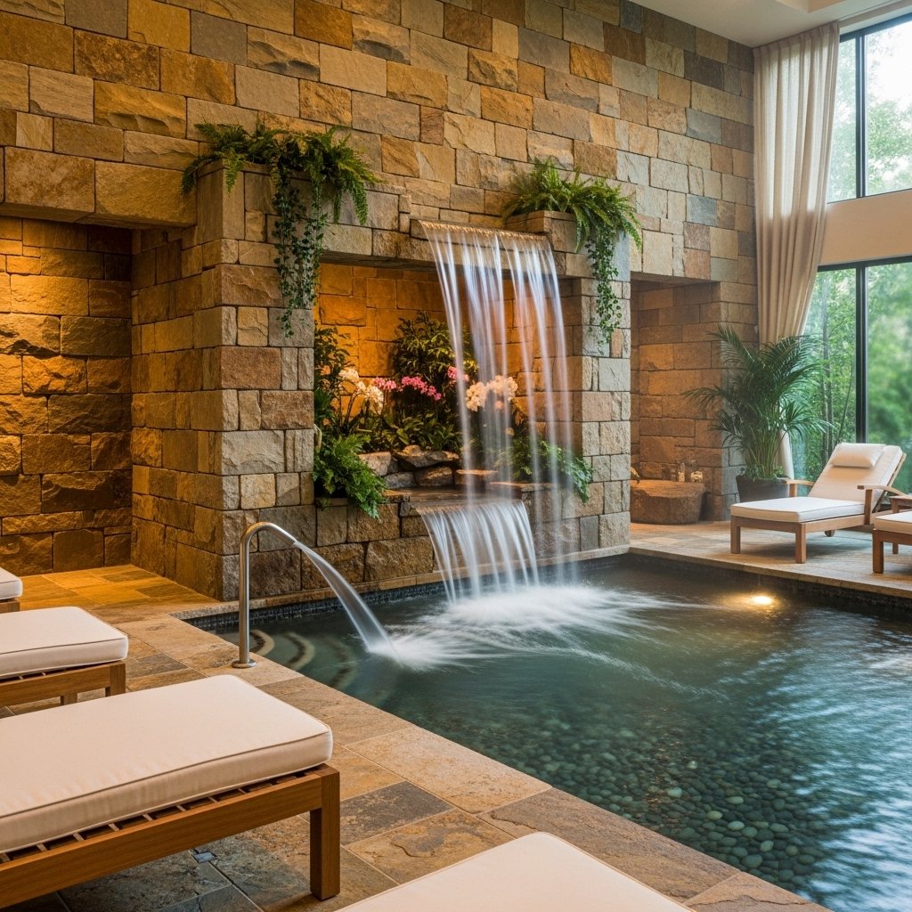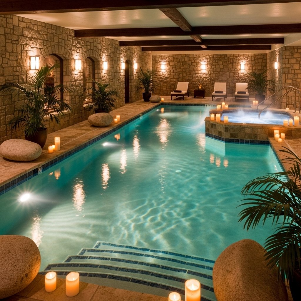 A natural stone interior pool focuses on earthy textures and organic materials. Stone walls, pebble flooring, and waterfall features create a natural environment. This design blends indoor comfort with outdoor aesthetics. It provides a calming and grounded atmosphere for relaxation. It is ideal for people who prefer a rustic yet luxurious style.