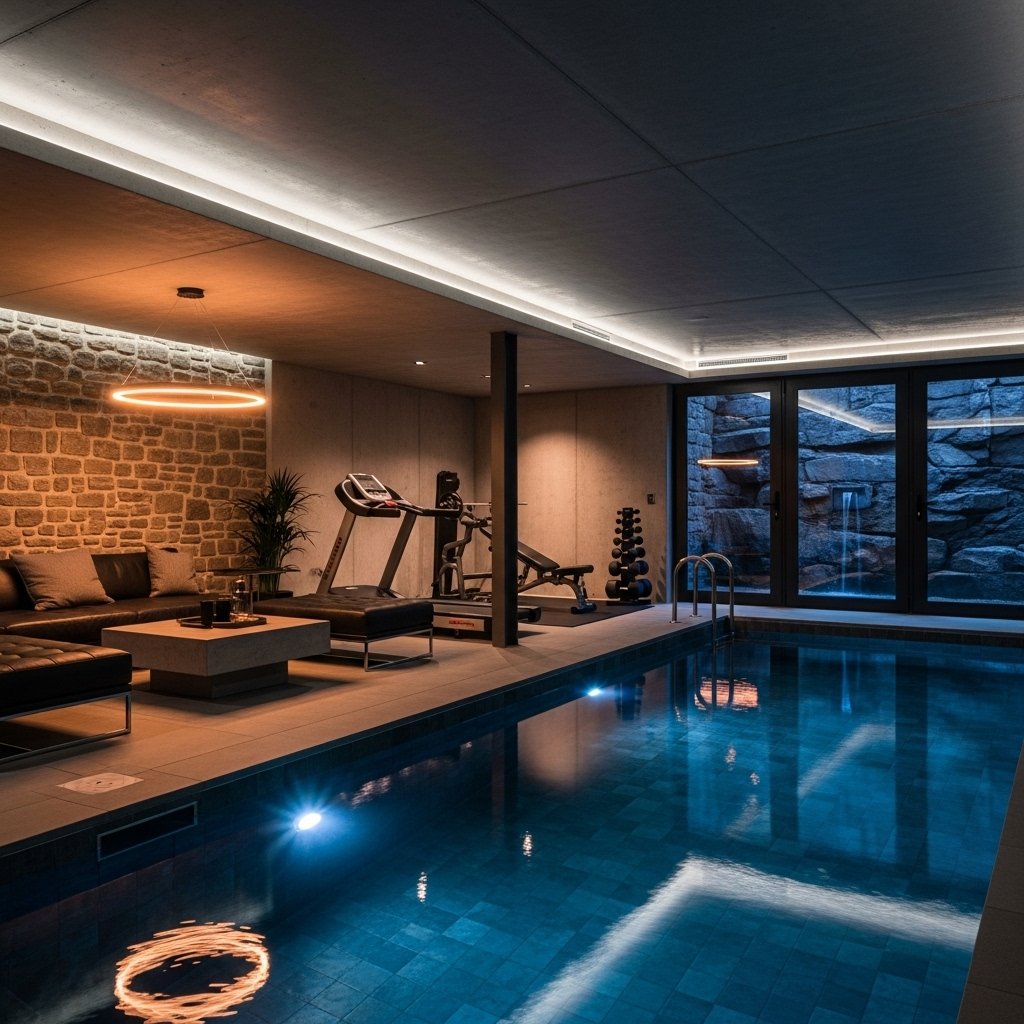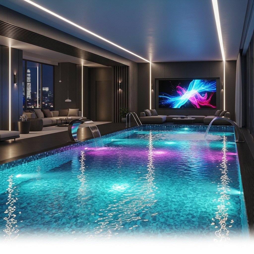 An LED-lit interior pool uses advanced lighting systems to create a vibrant atmosphere. Color-changing LED lights can transform the mood of the space instantly. This design is especially attractive during nighttime use. It enhances both safety and visual appeal around the pool area. It is a popular choice for modern and entertainment-focused homes.