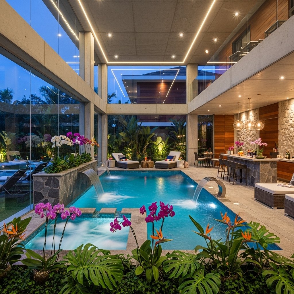 A tropical-themed interior pool brings nature indoors with lush greenery and natural textures. Palm plants, wooden decking, and stone walls are often included in the design. Warm lighting and waterfall features enhance the tropical atmosphere. This setup creates a vacation-like experience inside your home. It is ideal for people who want a relaxing escape environment year-round.