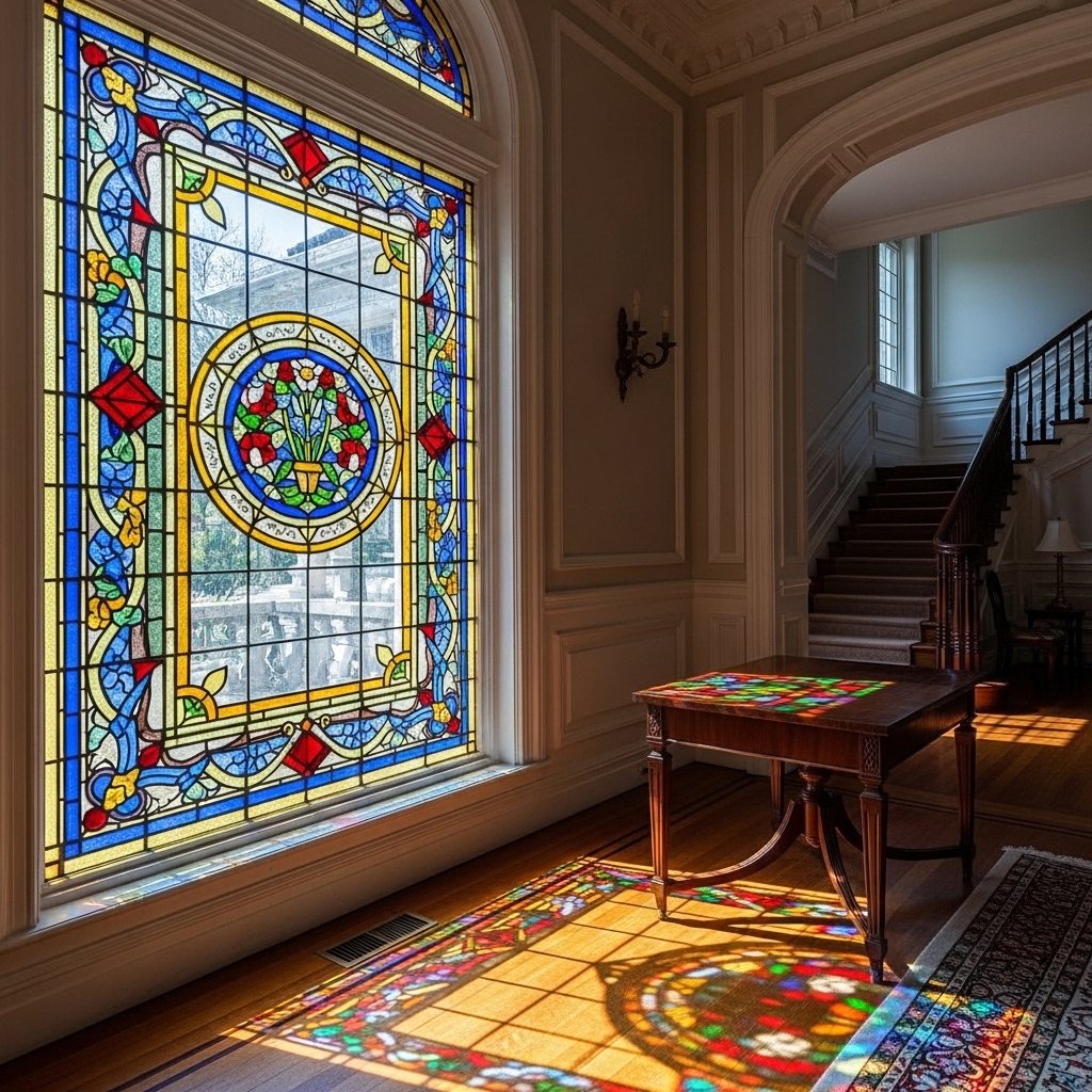 A stained glass interior window adds color and artistic flair to your home. It can serve as a focal point while still allowing light to pass through. This design works well in traditional or eclectic interiors. The patterns and colors can be customized to suit your style. It is a beautiful way to combine functionality with artistic expression.
