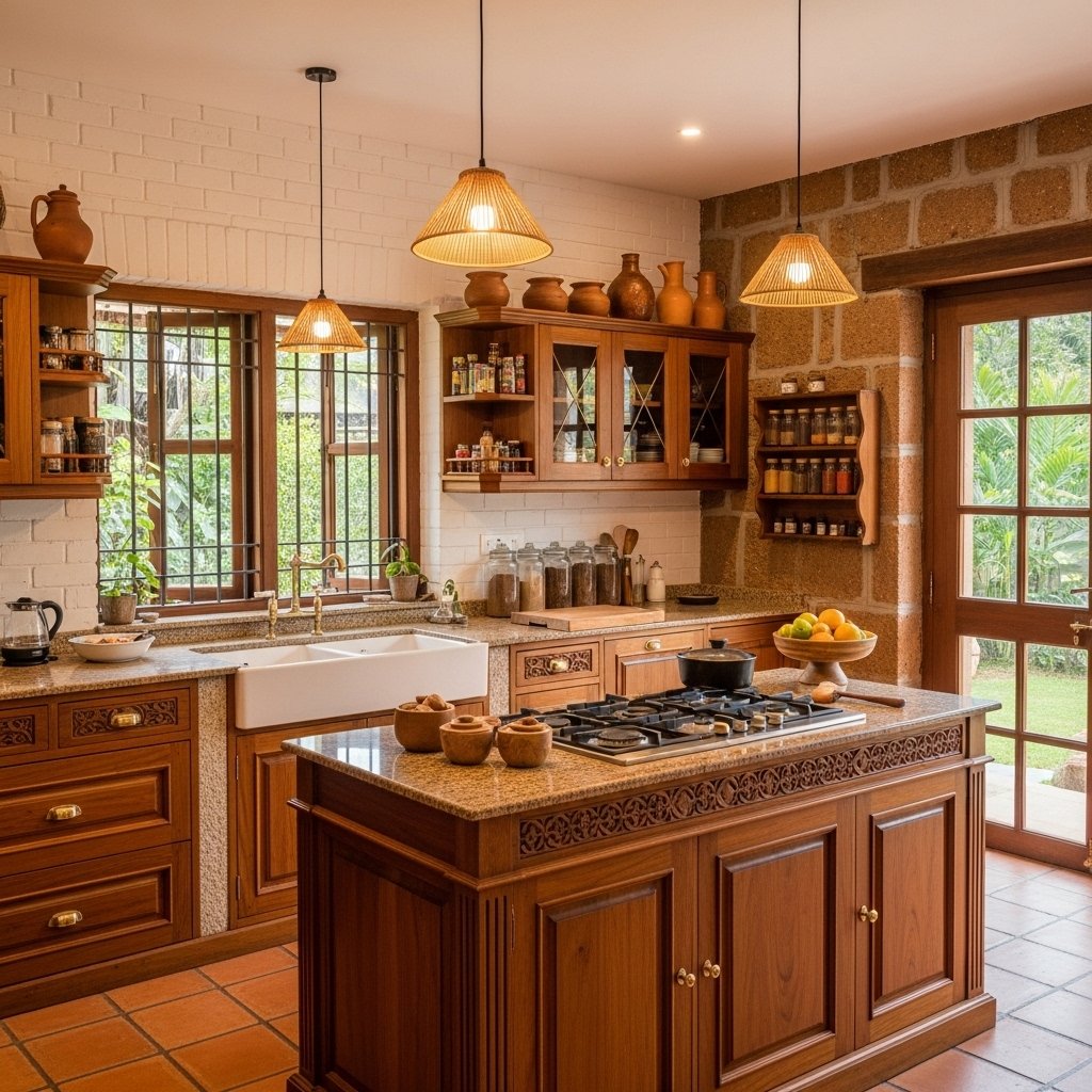 Kitchens in Kerala homes combine functionality with traditional design. Wooden cabinets and open shelving create a warm and inviting cooking space. Natural materials ensure durability while maintaining a classic look. Proper ventilation and lighting make the kitchen practical and comfortable. This design approach balances modern needs with traditional charm.