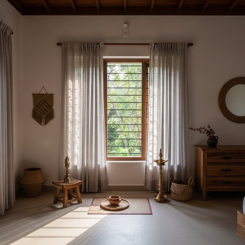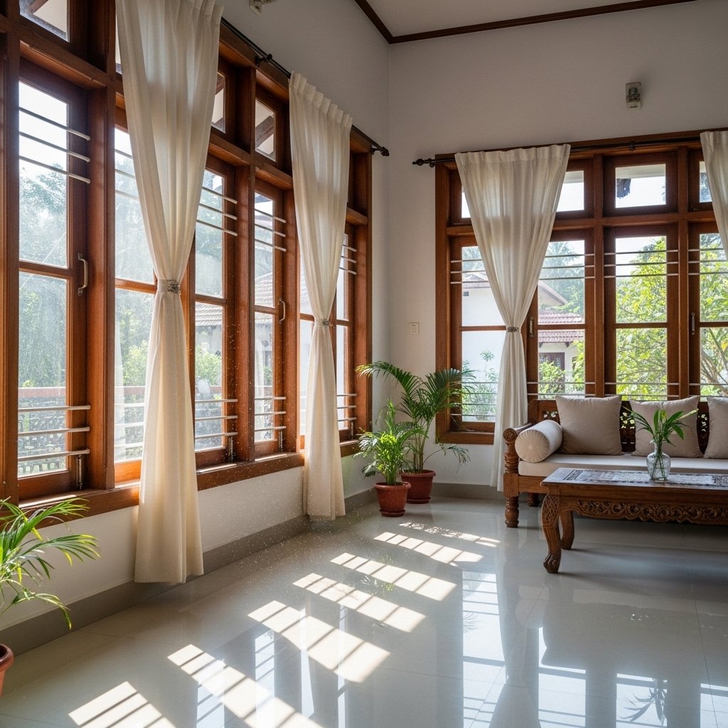 Large windows are a key feature in Kerala homes, allowing ample sunlight to enter. These windows improve ventilation and reduce the need for artificial lighting. Wooden frames add to the traditional aesthetic while maintaining durability. Sheer curtains can be used to control light without blocking it completely. This design creates a bright and airy atmosphere.