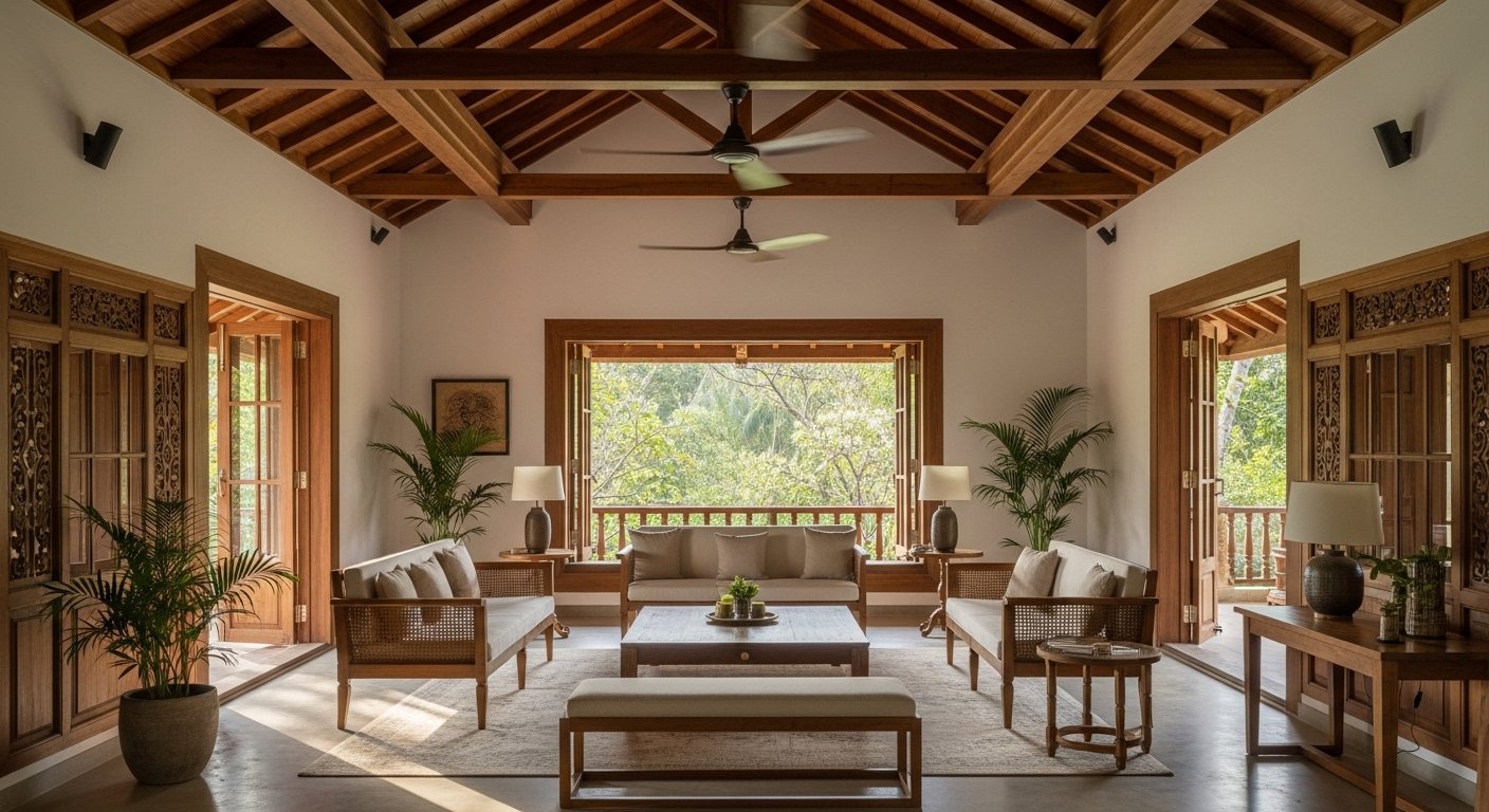 Kerala house interior style is a traditional design from Kerala that focuses on natural materials, wooden elements, and a calm atmosphere. It often includes wooden furniture, earthy colors, and simple layouts. This style creates a warm and peaceful environment that reflects culture and nature.