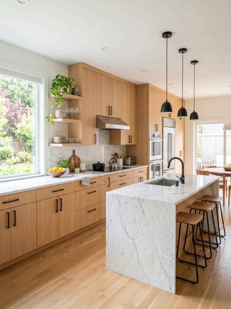 A light wood interior kitchen creates a fresh and welcoming cooking space. Cabinets made from light oak or birch give the kitchen a soft and natural appearance. These tones pair beautifully with white countertops, marble surfaces, or black hardware for contrast. The overall effect is clean, bright, and highly functional. A light wood kitchen also feels timeless, ensuring it remains stylish for years to come.