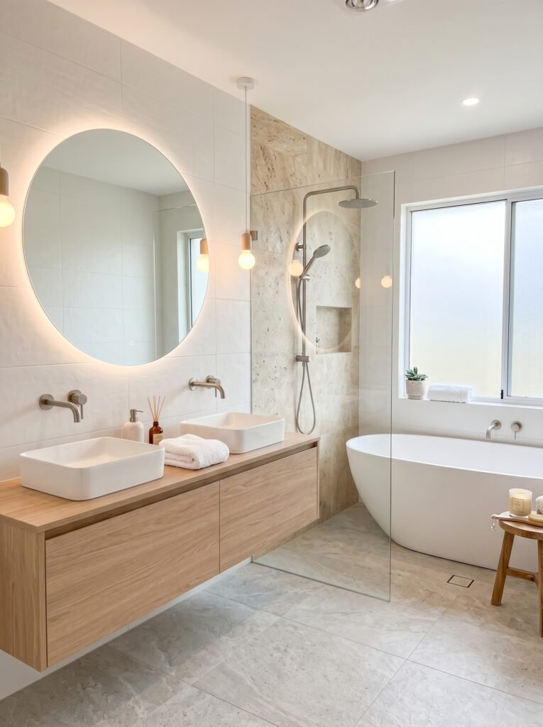 A bathroom with light wood elements feels spa-like and refreshing. Wooden vanities, shelving, or accents add warmth to typically cold spaces like bathrooms. Pairing light wood with white tiles or stone surfaces enhances the clean aesthetic. This combination creates a relaxing and natural atmosphere. A light wood bathroom feels both luxurious and calming.