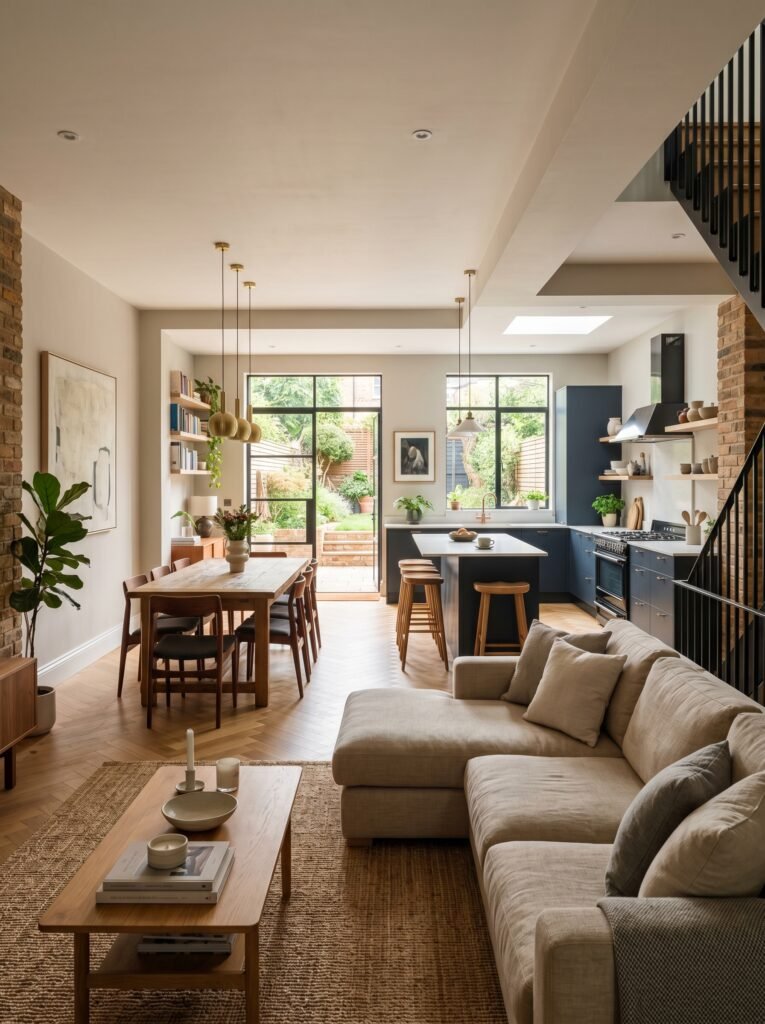 Many modern London townhouse interiors benefit from open-plan layouts. Removing unnecessary walls can make the space feel more expansive and connected. Combining the kitchen, dining, and living areas enhances functionality and flow. Use rugs or lighting to define different zones within the open space. This design approach is perfect for both everyday living and entertaining guests.