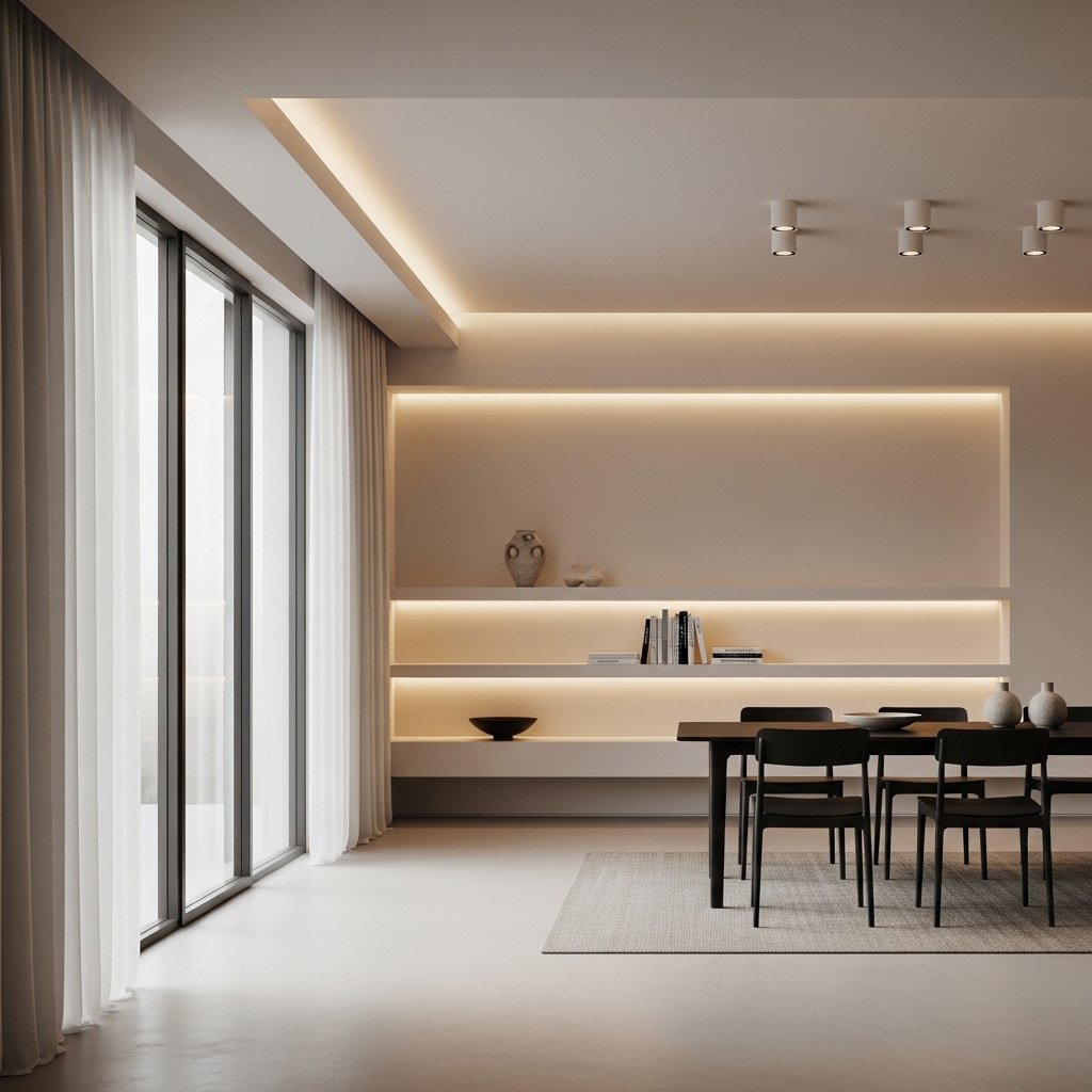 Lighting plays a crucial role in enhancing the ambiance of a luxury minimalist interior. Instead of overly decorative fixtures, opt for sleek and modern lighting designs that blend seamlessly with the space. Recessed lighting, hidden LED strips, and elegant pendant lights create a soft and inviting glow. Layered lighting adds depth and highlights architectural features. Proper lighting transforms a simple space into a warm and luxurious environment.