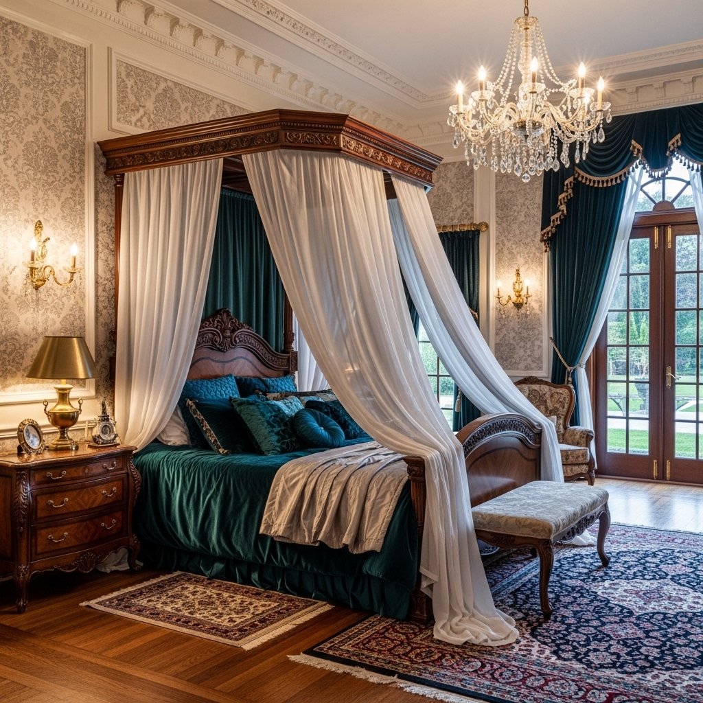 A canopy bed instantly defines a mansion interior bedroom with its dramatic presence and timeless elegance. Tall frames with flowing fabrics create a sense of privacy while adding softness to the space. Rich materials like velvet or silk enhance the luxurious feel and elevate the overall aesthetic. Neutral tones or deep jewel colors can be used depending on the desired ambiance. This design works beautifully as the focal point, drawing attention while maintaining a regal atmosphere.