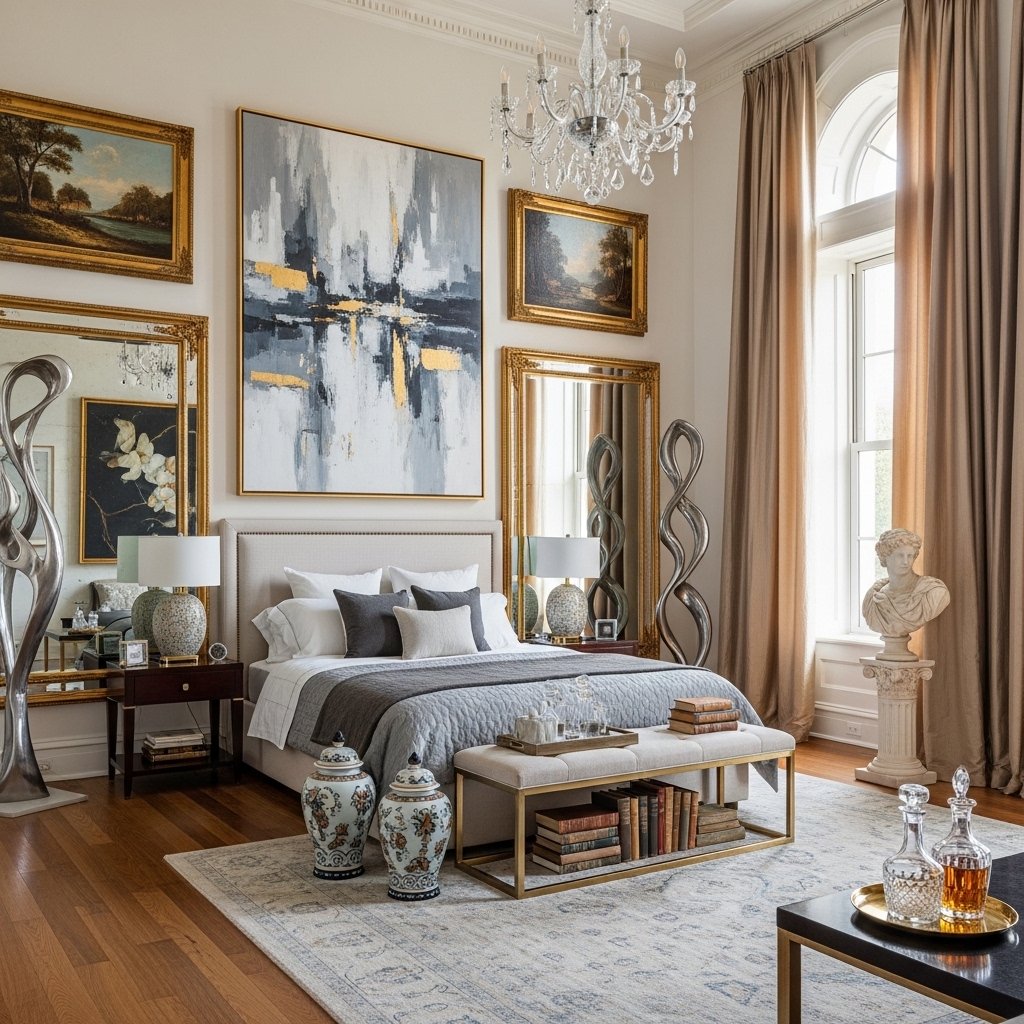 Artwork and décor bring personality and sophistication to a mansion interior bedroom. Large paintings, sculptures, or curated wall art can act as focal points within the space. Carefully chosen accessories like vases, mirrors, and decorative trays enhance the overall design. These elements should complement the room’s color palette and theme. Thoughtful decoration ensures the space feels curated rather than cluttered.