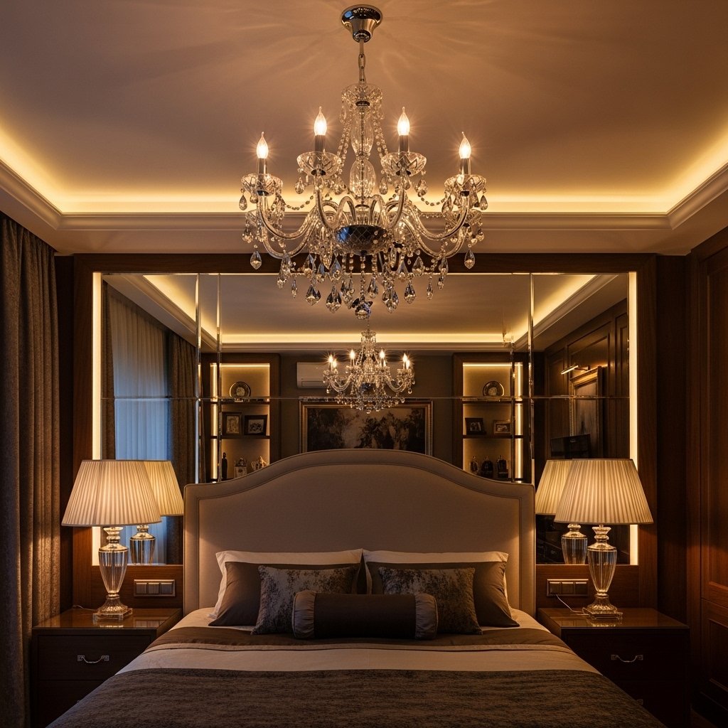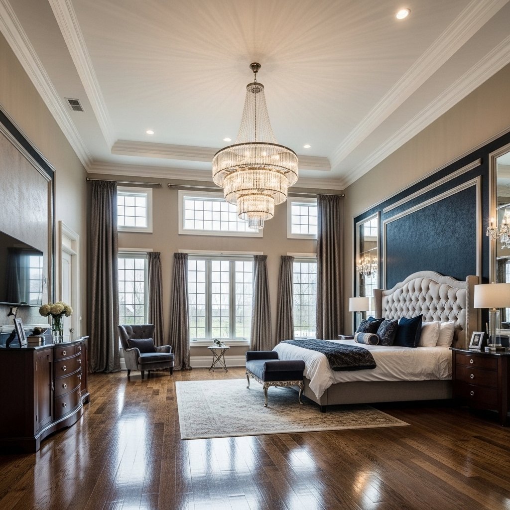 High ceilings are a signature feature in mansion bedrooms, creating an open and airy environment. Adding a statement chandelier enhances the grandeur while providing soft, ambient lighting. Crystal or modern geometric chandeliers can be chosen to match the bedroom’s theme. This combination not only improves lighting but also acts as an artistic centerpiece. The result is a space that feels expansive, elegant, and visually captivating.