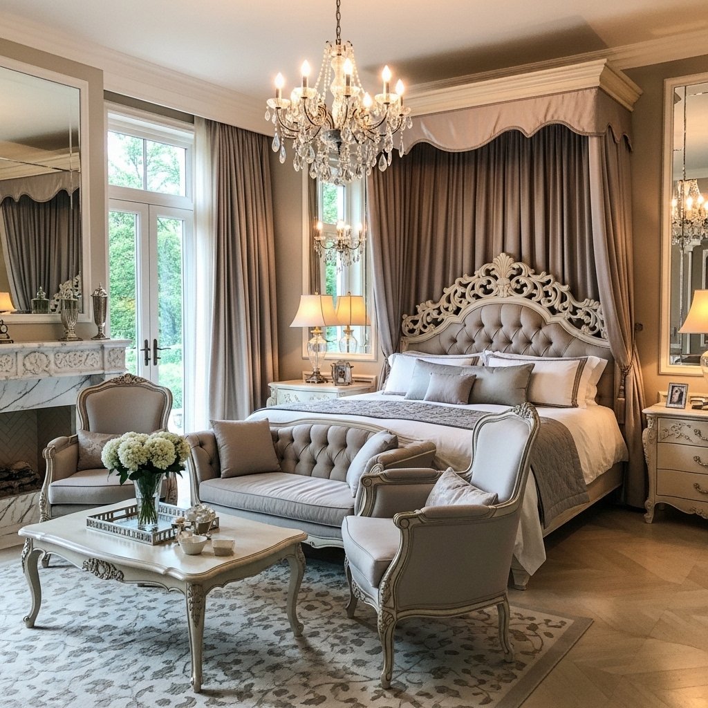 Adding a seating area transforms a mansion bedroom into a complete living space. Plush armchairs, chaise lounges, or a small sofa provide comfort for relaxation or reading. Soft fabrics and elegant shapes enhance the luxurious vibe while maintaining functionality. This area can be styled with accent tables, rugs, and decorative pillows for added charm. It creates a cozy yet upscale environment within the larger bedroom layout.
