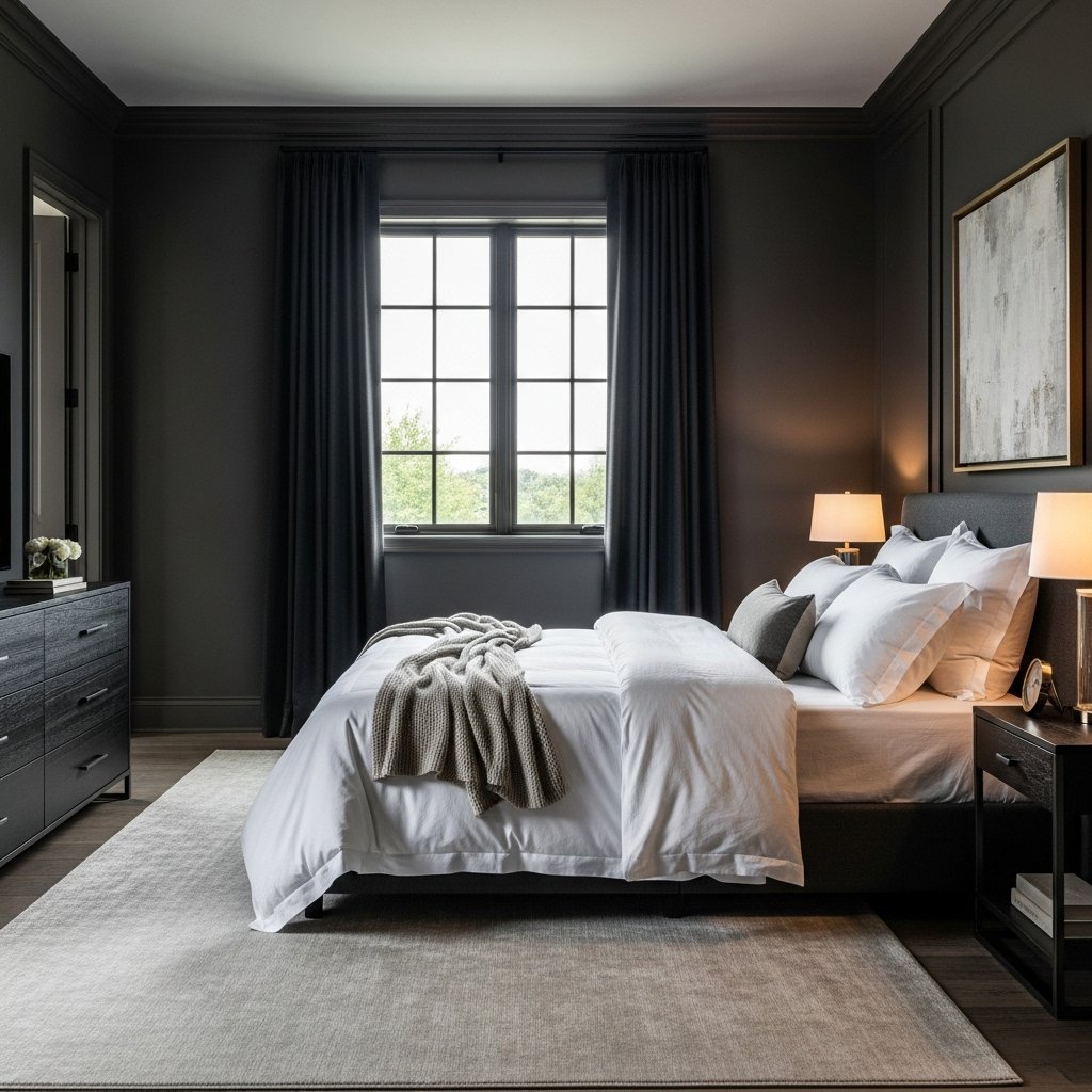 Start with a dark base for walls, furniture, or accent pieces to create a bold and cohesive look. Colors like charcoal gray, deep navy, black, or earthy browns bring sophistication and a masculine feel. Pair these with lighter neutral shades on bedding, curtains, or rugs to maintain contrast and prevent the room from feeling too heavy. A consistent palette across furniture, décor, and accessories ensures the minimalist theme stays clean and intentional. This sets the foundation for a modern dark bedroom aesthetic.