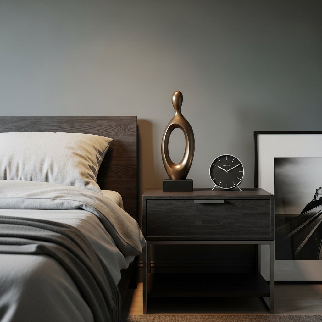 Metallic elements like brushed gold, copper, or matte black can add sophistication and modernity to dark rooms. Consider accessories such as lamps, drawer handles, or small décor items. Matte finishes prevent reflective surfaces from overwhelming the dark aesthetic. These subtle accents add style and elegance without disrupting the minimalist theme. They help create a polished and contemporary masculine vibe.